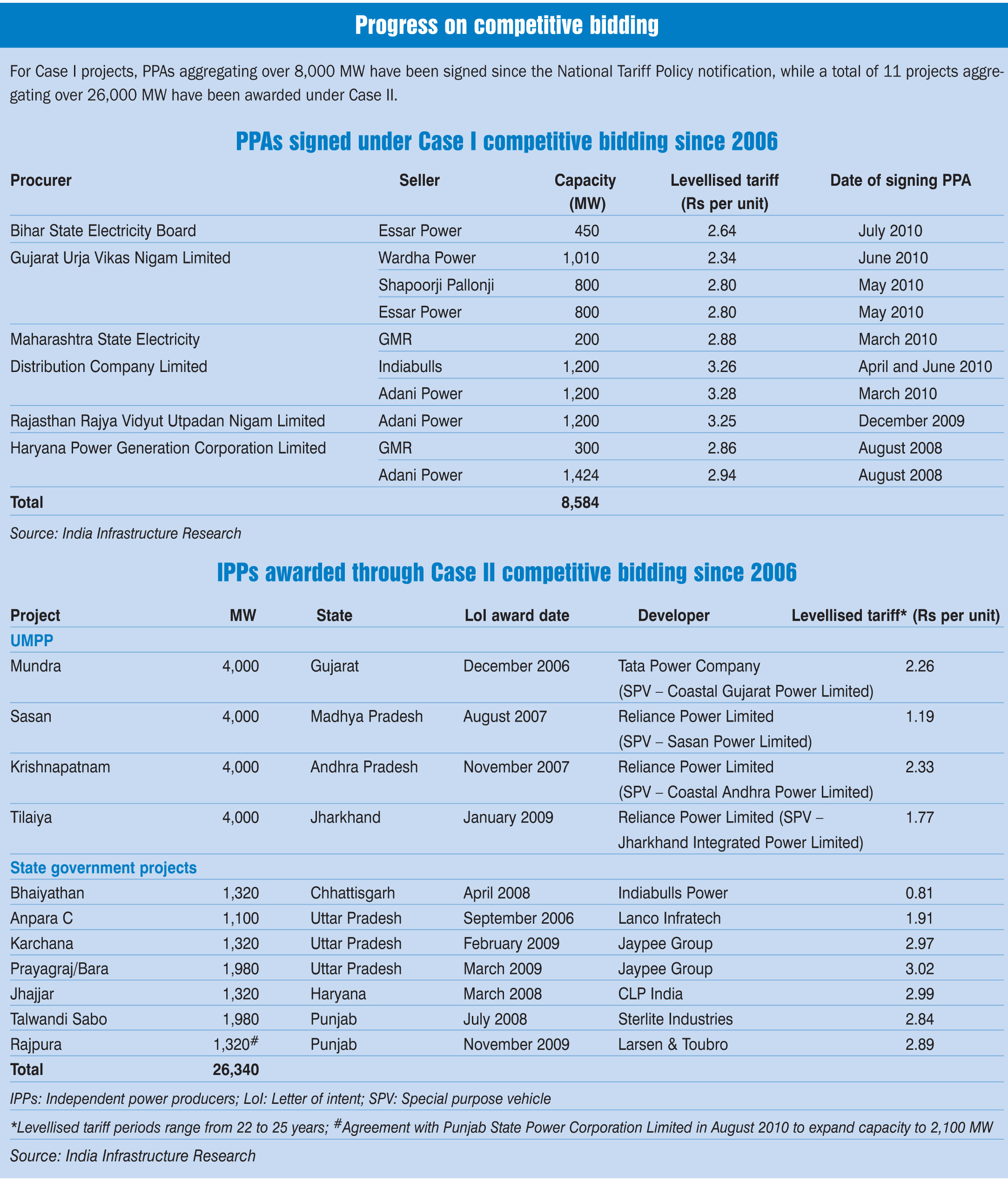 Projects based on imported coal: Indonesia’s new coal pricing regulation has meant an increase in the landed price of fuel. Indonesian coal prices will now have to be benchmarked against a set of international and domestic indices, and by September 2011 all coal contracts would be modified retrospectively. This implies that the long-term contracts, which were based on discounts or flat pricing, will not be honoured. At least 17,000 MW of Indian projects will be directly impacted by this regulation (including Adani Power’s 1,980 MW Tiroda and 2,640 MW Mundra projects; Lanco Infratech’s 507.5 MW Udupi project; Tata Power’s 4,000 MW Mundra UMPP; and JSW Energy’s 300 MW Ratnagiri project). Also, Australia is planning to levy a coal tax and other coal exporting countries may follow suit.