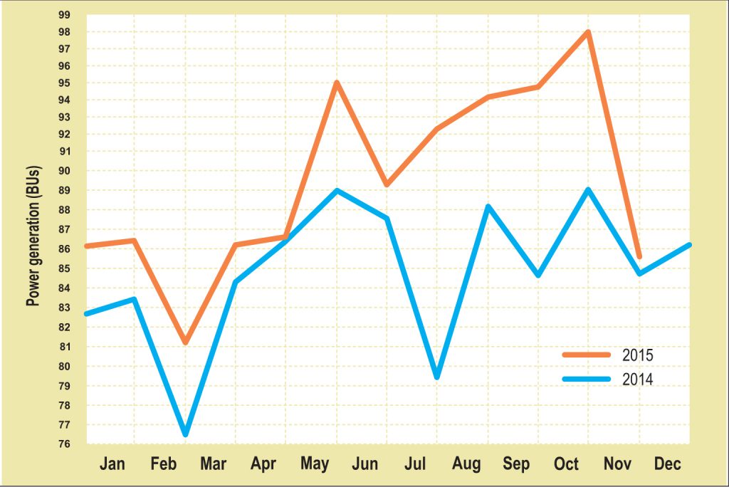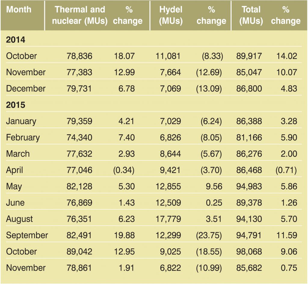 Power Generation: Monthly statistics year over year Monthly statistics year over year January 26, 2016 Total power generation increased by 0.75 per cent in November 2015 as compared to the same month in the previous year, with an increase of 1.91 per cent in thermal and nuclear generation, and a 10.99 per cent decrease in hydel generation.
