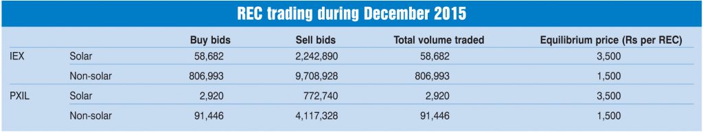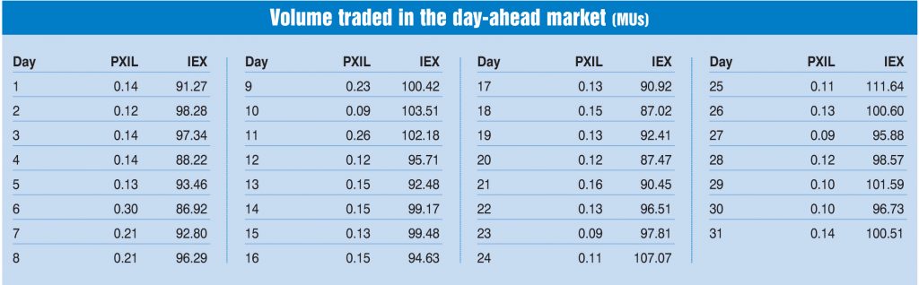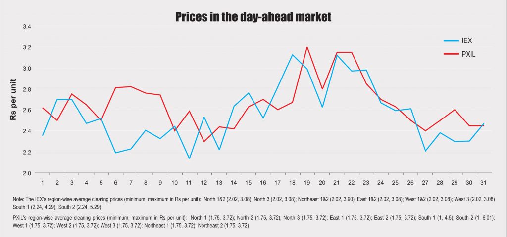 The electricity traded in the day-ahead market at the IEX and PXIL in December 2015 was 2,987.35 MUs and 4.51 MUs respectively. The average market clearing price range at the IEX was Rs 2.13 per unit to Rs 3.12 per unit and at PXIL it was Rs 2.30 per unit to Rs 3.20 per unit.