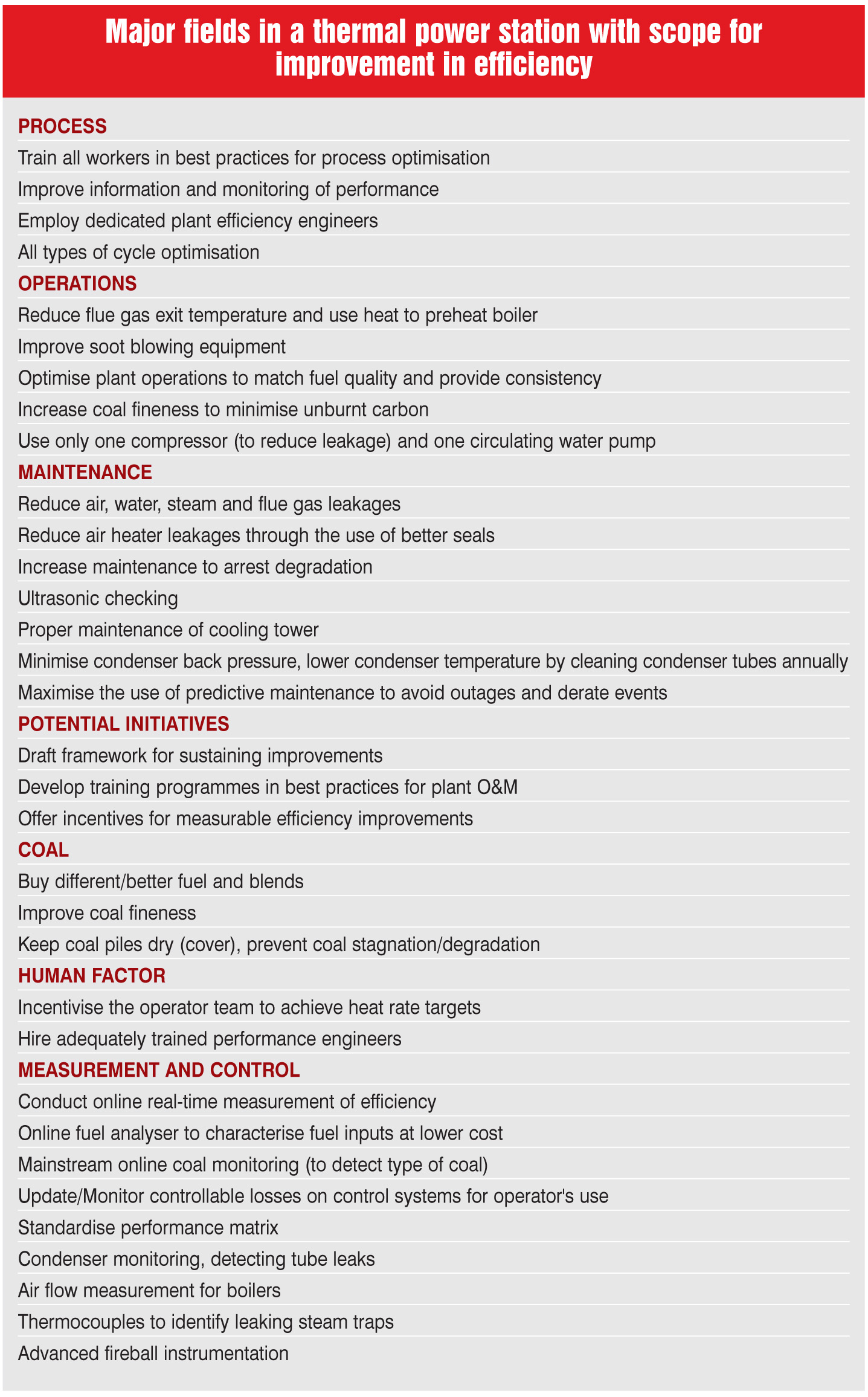 Therefore, it is essential to implement operations and maintenance (O&M) best practices for improving a plant’s energy efficiency. These best practices entail following well-established operating procedures, reducing the operating period of the unit at low loads or beyond the design limit, cycling the unit as per the recommendations of the manufacturers, and operating controllable parameters as per the original equipment manufacturer guidelines. In old plants, greater efforts are needed to bring back units to their rated capacity. Also, phasing out of inefficient units to keep pace with the latest technologies is the need of the hour.