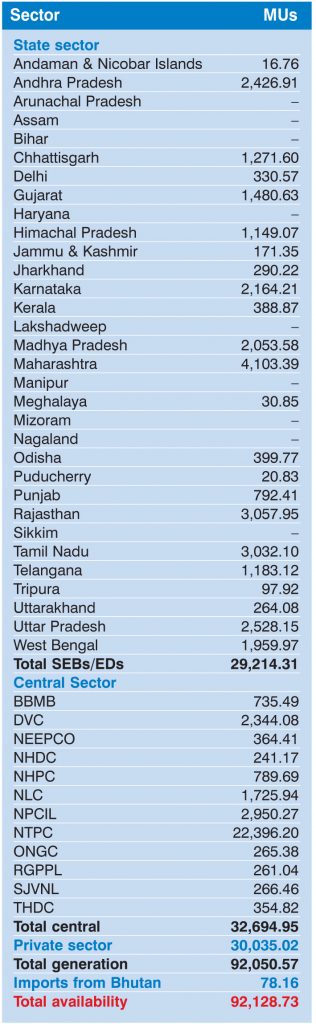Generation: January 2016 January 2016 March 29, 2016 Total power generation stood at 92.05 billion units. At around 32.69 billion units and 29.21 billion units respectively, the central and state sectors accounted for the major share of generation.