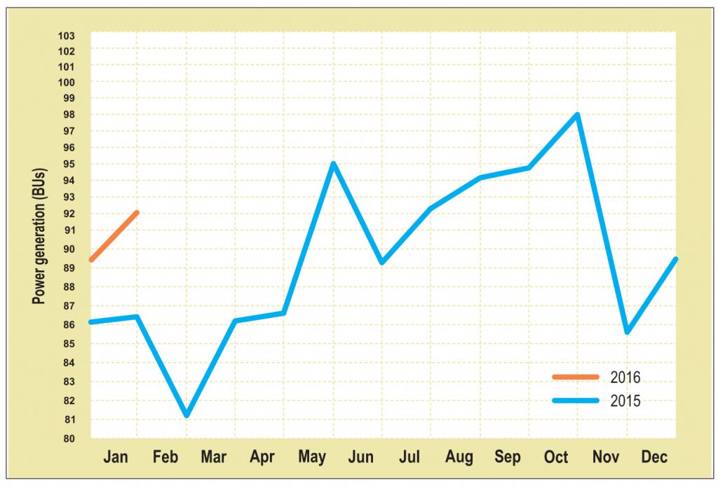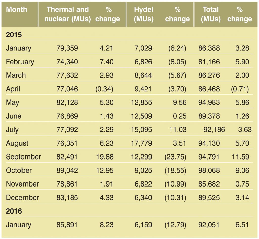 Power Generation: Monthly statistics year over year Monthly statistics year over year March 29, 2016 Total power generation increased by 6.51 per cent in January 2016 as compared to the same month last year, with an increase of 8.23 per cent in thermal and nuclear generation and a 12.79 per cent decrease in hydel generation.