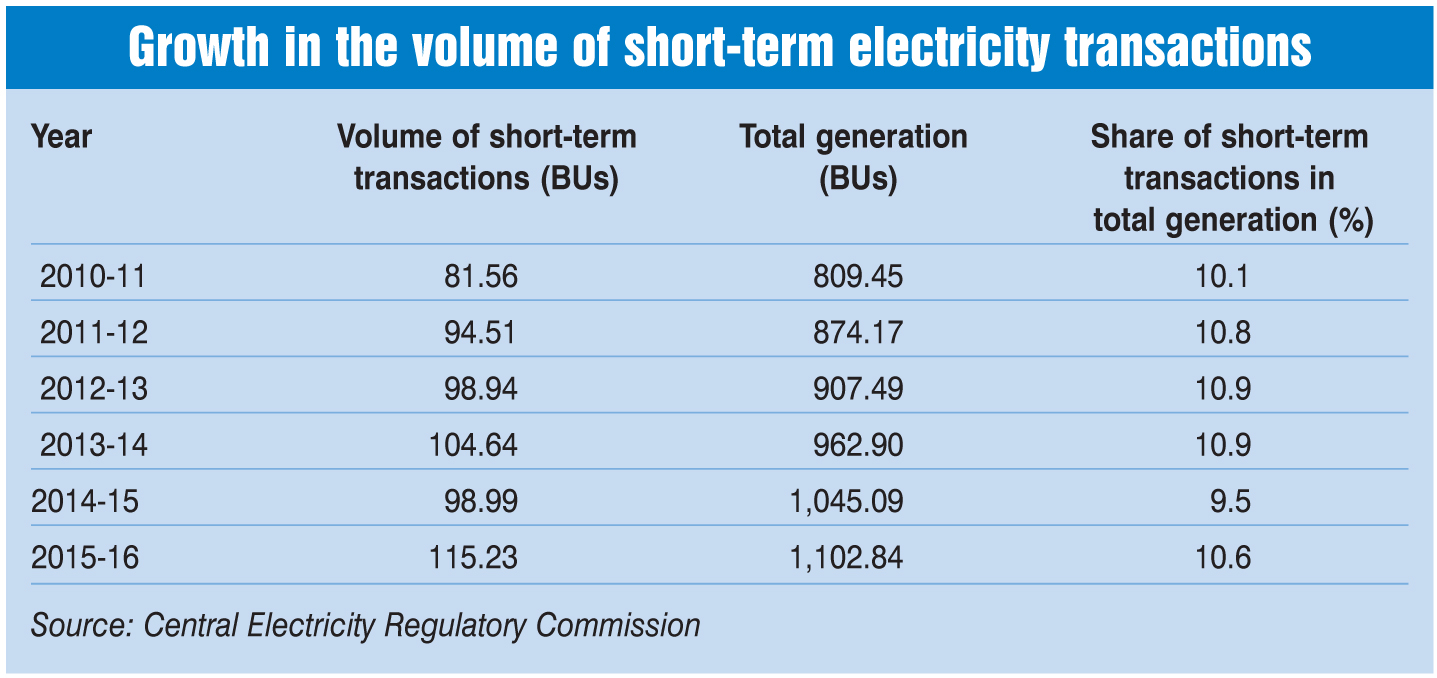 The short-term market provides a non-discriminatory platform and national-level access to participants for transparent price discovery. It provides a number of options for power procurement including buying power directly from generators through one-to-one contracts, from power trading licensees wherein traders have contracts with the generator, from power exchanges, and through unscheduled interchanges (which is essentially a grid management tool, but is used by suppliers and distribution companies to feed or draw power over and above what is scheduled). Overall, the share of short-term market transactions in total power generation has increased from 6.1 per cent in 2008-09 to 10.6 per cent in 2015-16.
