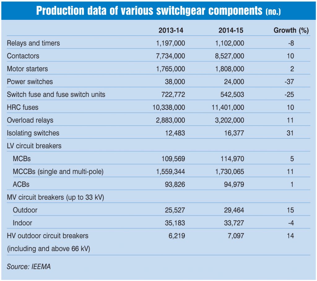 In value terms, the LV switchgear industry grew by 5.6 per cent in 2013-14 and at only around 1.5 per cent in 2014-15. In terms of volumes, while the production of some components including isolating switches, overload relays, contactors, etc. increased in 2014-15 as compared to 2013-14, the production of power switches and switch fuses saw a significant fall during the year. The production of circuit breakers increased overall, with a decline in only the production of indoor MV circuit breakers.