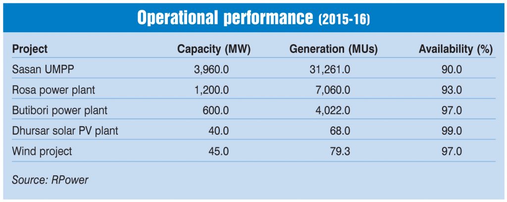RPower operates 5,945 MW of generation capacity, of which the majority (5,760 MW) is coal based, while the remaining is based on renewable sources. Among its coal-based power plants, the 3,960 MW Sasan UMPP in Madhya Pradesh accounts for the largest share. Its other coal-based projects are the 1,200 MW Rosa project in Uttar Pradesh and the 600 MW Butibori power project in Maharashtra.