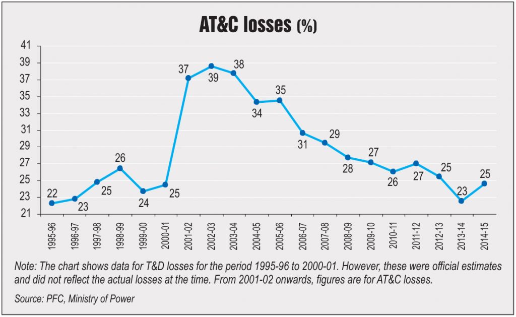 Till the 1990s, the officially declared estimates showed that the transmission and distribution (T&D) losses ranged from 22 per cent to 26 per cent. Actual estimates were undoubtedly much higher, at close to 40-50 per cent. In 2001-02, the concept of AT&C losses was introduced to precisely measure the gap between billing and collection. The losses were estimated at around 37 per cent. A mega reform move, the Accelerated Power Development and Reforms Programme, was launched in 2003 with the promise of bringing down losses to 15 per cent by 2007. However, the segment failed to come out of the red with AT&C losses still at a significant 31 per cent at the end of the programme. The APDRP was re-launched in 2008 as the Restructured Accelerated Power Development and Reforms Programme (R-APDRP) with revised terms and conditions. It did bring in some positive results, with AT&C losses reducing to 24.6 per cent in 2014-15. The R-APDRP is now a part of the newly launched Integrated Power Development Scheme (IPDS), which is much bigger in scope and coverage than its predecessor. Also, instead of aiming for a uniform reduction, a discom-wise loss reduction trajectory has now been adopted for bringing down AT&C losses by 2021-22.