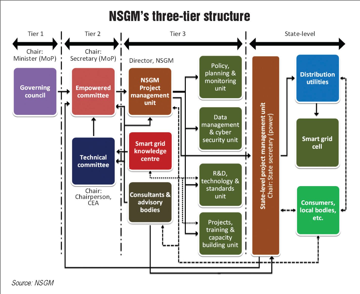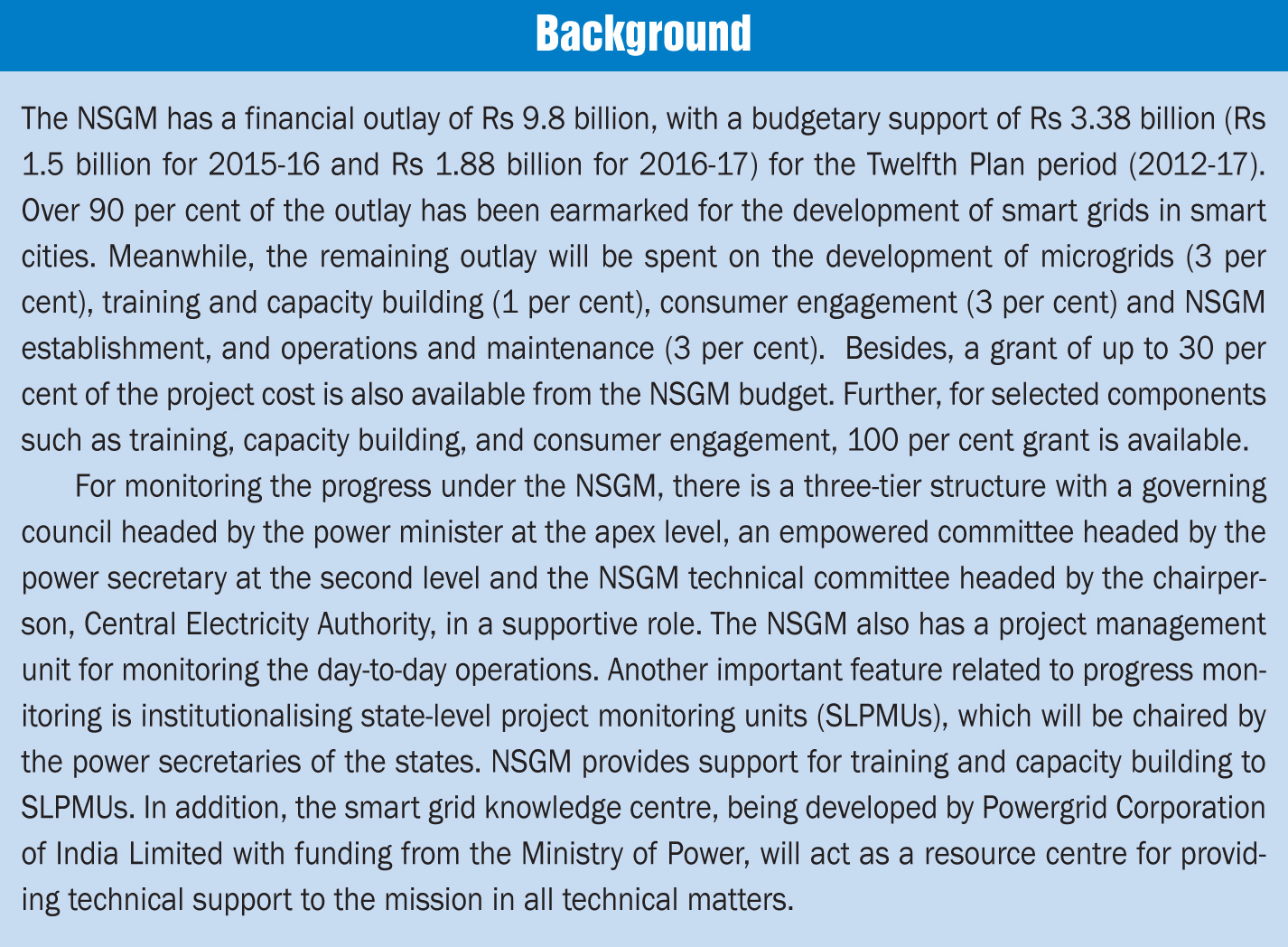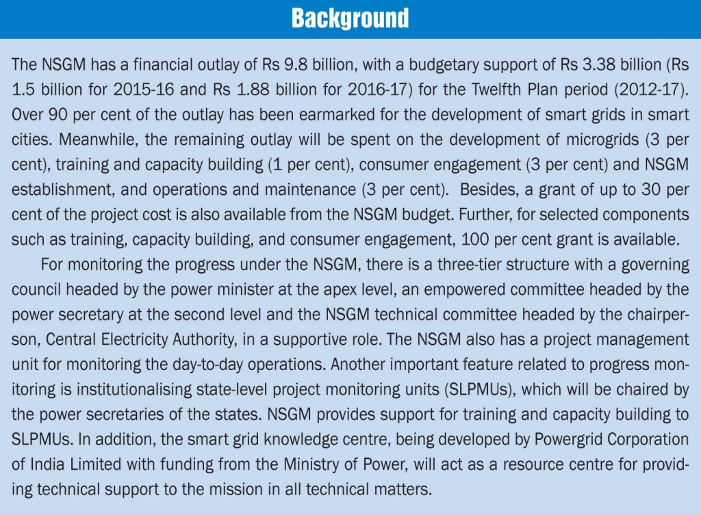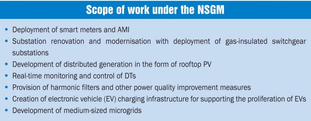 The National Smart Grid Mission (NSGM) was launched in March 2015 with the aim of creating an institutional mechanism for planning, monitoring and implementing policies and programmes related to smart grid activities. In order to achieve the goals under the mission, a series of smart grid projects is being developed across the country. Four smart grid projects, two in Maharashtra, and one each in Chandigarh and Uttar Pradesh, have so far been approved and are at various stages of implementation. These projects will be equipped with functionalities such as advance metering infrastructure (AMI), outage management system (OMS), demand response (DR), and supervisory control and data acquisition (SCADA).