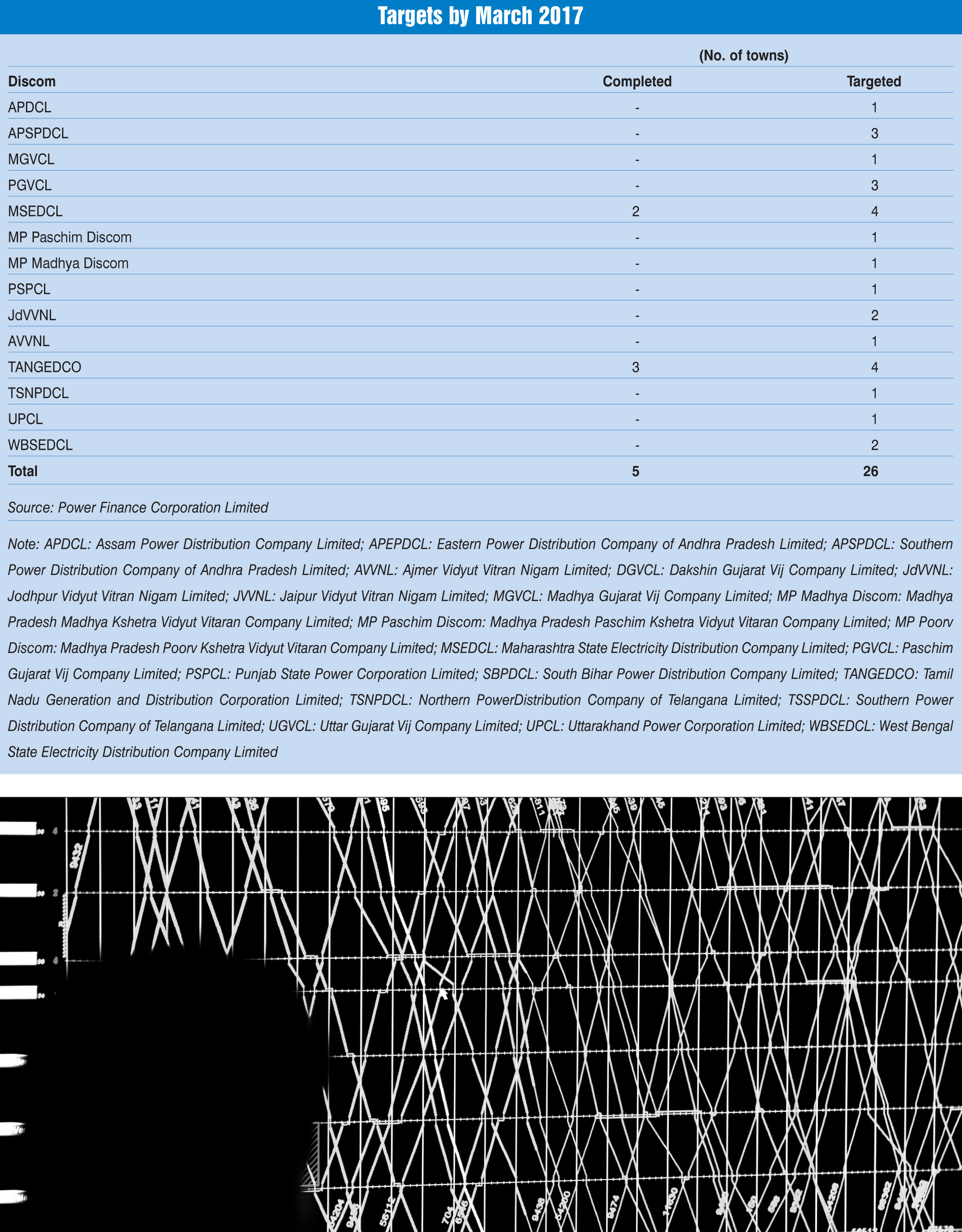 Since the sanction of 72 towns under the SCADA component of the R-APDRP (which has now been subsumed in the IPDS), significant progress has been achieved. As of January 2017, 47 SCADA control centres have been commissioned. SCADA is now fully functional in five towns (three in Tamil Nadu and two in Maharashtra) and by March 2017, it is expected to be completed in another 17 towns. The following is a snaphot of the SCADA projects under implementation by discoms….