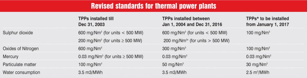 The revised standards to be met by the various categories of thermal power plants (TPPs) by December 2017 are given in the accompanying table. The norms are proposed to be implemented in a phased manner and the plants are divided into three categories based on their installation dates. Although the country did not have SO2, NOx and mercury emission norms earlier for coal-based thermal power plants, it had standards for PM10 emission that were lax by global standards. The emission standards have been made progressively stringent for newer plants, thus elevating their costs.