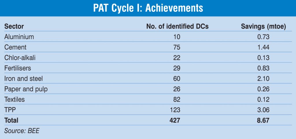 Under Phase I of PAT, 478 DCs were covered across eight sectors such as aluminium, cement, chlor-alkali, fertiliser, iron and steel, paper and pulp, thermal power and textiles. These units cumulatively consumed close to 165 million tonnes of oil equivalent (mtoe) of energy. Overall, the units were required to cumulatively achieve a 4.05 per cent reduction in their average energy consumption by the end of the cycle, or an annual reduction of around 6.686 mtoe of energy and approximately 23 million tonnes (mt) of carbon dioxide.