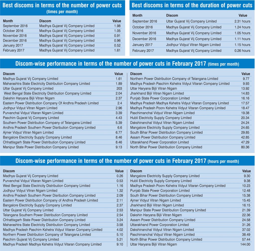Power Line takes a look at the comparative performance of discoms based on two key parameters – the frequency of power cuts and the duration of power cuts during the past six months. Based on the data sourced from the Ministry of Power’s URJA India portal, Madhya Gujarat Vij Company Limited (MGVCL) has consistently been the top performer with the lowest number of power cuts per month. In terms of the duration of power cuts too, MGVCL was the top performer for four of the six months under review. Uttar Gujarat Vij Company Limited and Rajasthan’s Jodhpur Vidyut Vitran Nigam Limited held the top slot in the remaining two months. A snapshot of the performance of major discoms…