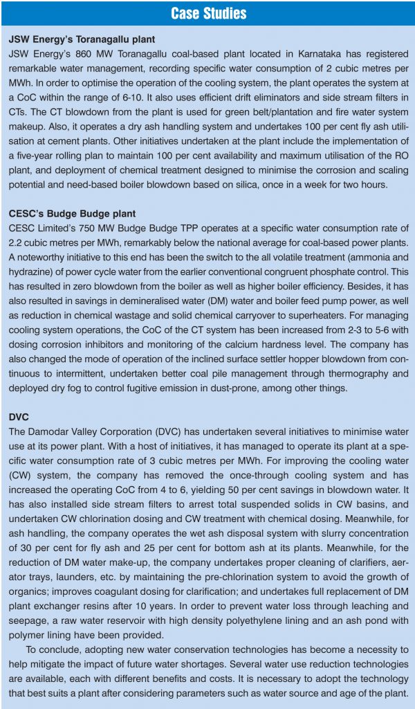In order to minimise the water requirement for ash handling, TPP developers are re-evaluating wet ash-handling practices. Dry bottom ash handling techniques, optimisation of ash water ratios and use of treated water for ash handling are some of the solutions being considered. In the medium term, all lean concentration slurry could be converted to medium concentration and recycling of ash pond water could be undertaken. This can reduce water consumption for ash handling to 750 million cubic metres per year. Meanwhile, in the long run, redesigned centrifugal pumps could be used for transporting fly ash slurry with 45 per cent concentration for distances up to about 3 km, and positive displacement pumps could be used for transporting fly ash slurry with 50-55 per cent concentration for distances between 3 km and 8 km. These measures will reduce water consumption for ash handling to 350 million cubic metres per year. Besides, waterless management of ash is possible through 100 per cent ash utilisation and the storage of dry ash in silos.