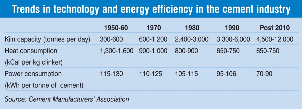 The specific thermal energy consumption and electrical energy consumption for state-of-the-art Indian cement plants are as low as 658 kCal per kg of clinker and 67 kWh per tonne of cement respectively. These values are comparable with those at the best cement plants in Japan, where the specific thermal energy consumption and electrical energy consumption are 650 kCal per kg of clinker and 65 kWh per tonne of cement respectively.