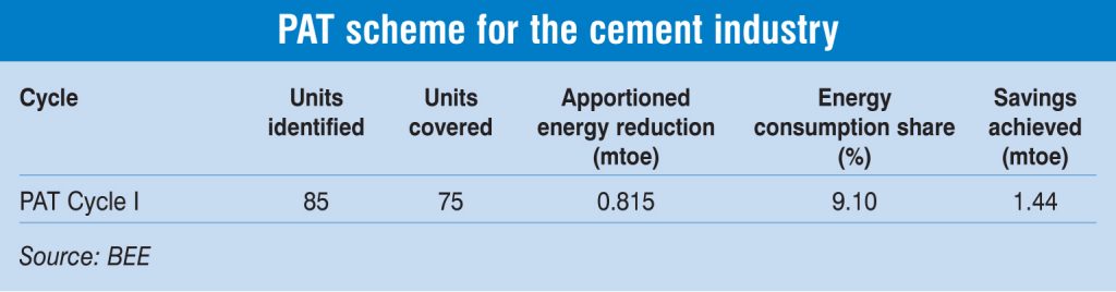 One of the key regulatory drivers for energy efficiency in the cement industry has been the Bureau of Energy Efficiency’s (BEE) Perform Achieve and Trade (PAT) scheme. This is essentially a mechanism intended to reduce specific energy consumption in energy-intensive industries (across eight industrial sectors including the cement industry), with an associated market-based mechanism to enhance cost effectiveness through the issuance of energy saving certificates.