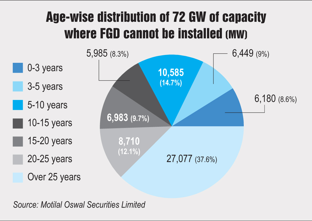 The CEA has identified about 72 GW of thermal capacity that is not in a position to install FGD due to the non-availability of space and hence will not be able to comply with the new SOx emission norms. It would not be prudent to incur additional expenditure for meeting the norms partially for SPM and NOx and thus could be phased out.