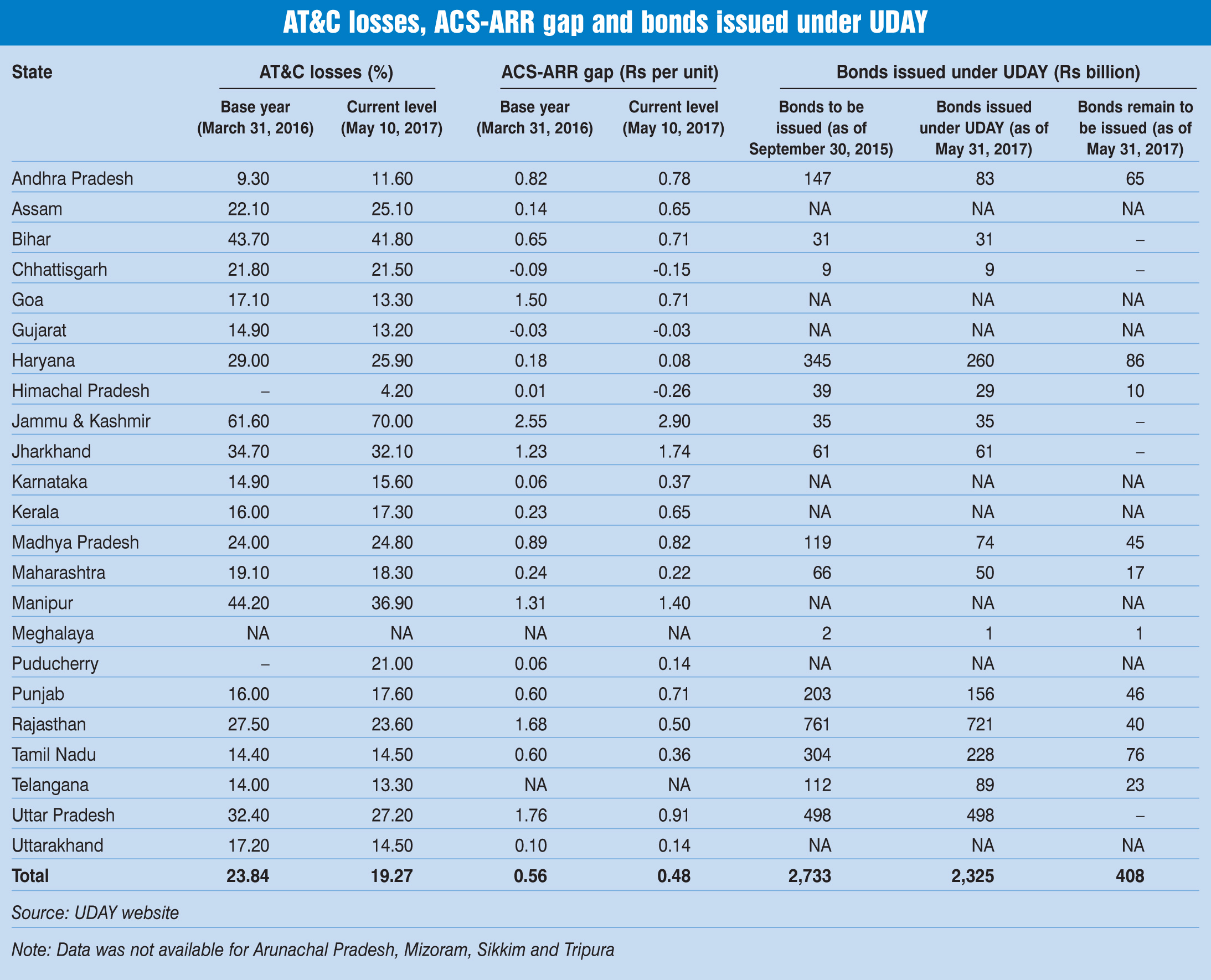 By 2019, the programme targets to achieve 15 per cent aggregate technical and commercial (AT&C) losses and a zero ACS-ARR (average cost of supply and average revenue realised) gap. Discoms in some UDAY states have started reaping the benefits through savings in interest costs and operational efficiencies. However, the programme is yet to have an impact in many states, about 10 of which have joined it over the past six to nine months and some of these are yet to implement the scheme to its fullest.