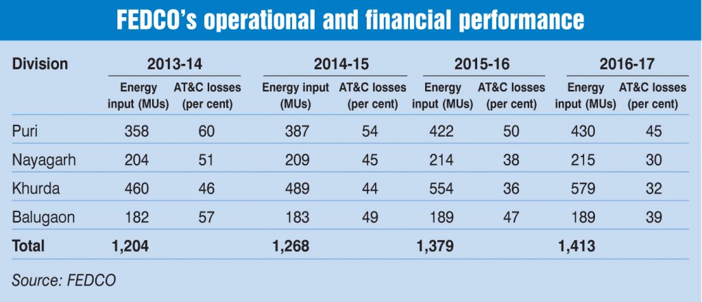 In the past four years, FEDCO has managed to achieve a turnaround in its distribution areas in terms of operational performance. On the energy input front, in 2015-16, FEDCO’s input stood at 1,379 MUs, an increase of 14.53 per cent over that in 2013-14. Meanwhile, with regard to AT&C losses, between 2013-14 and 2016-17, FEDCO has managed to lower the loss level by around 21 per cent, despite increase in the energy input and consumer base. Notably, among the three distribution franchise contracts for 14 districts under CESU awarded in 2013, FEDCO has registered the maximum reduction in AT&C losses in the past four years. The other two franchisees, with a similar rural-urban population mix, recorded loss reduction of 11 per cent and 4 per cent respectively. In 2015-16, FEDCO’s AT&C losses stood at around 37 per cent. Meanwhile, its collection efficiency stood at 95 per cent and accurate metering was recorded up to 86 per cent in 2015-16.