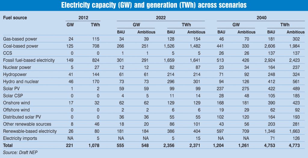 - The share of non-fossil fuel-based capacity in electricity is expected to reach 57-66 per cent by 2040. Specifically, renewable capacity is expected to increase to 597-710 GW by 2040, translating into a 50-56 per cent and 29-36 per cent share in the total installed capacity and generation respectively (as compared to 14 per cent and 6.5 per cent in March 2016).