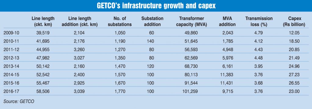 Gujarat’s state transmission company, Gujarat Energy Transmission Corporation Limited (GETCO) has drawn up a comprehensive plan for modernising and augmenting its infrastructure over the next four years. Investments in transmission are driven by the need to meet the increasing power load, modernise ageing and obsolete assets as well as accommodate the upcoming generation capacity including variable renewable energy capacity. The transmission company plans to invest over Rs 11 billion until 2021 to add 80-100 substations and 2,800 ckt. km of lines annually.