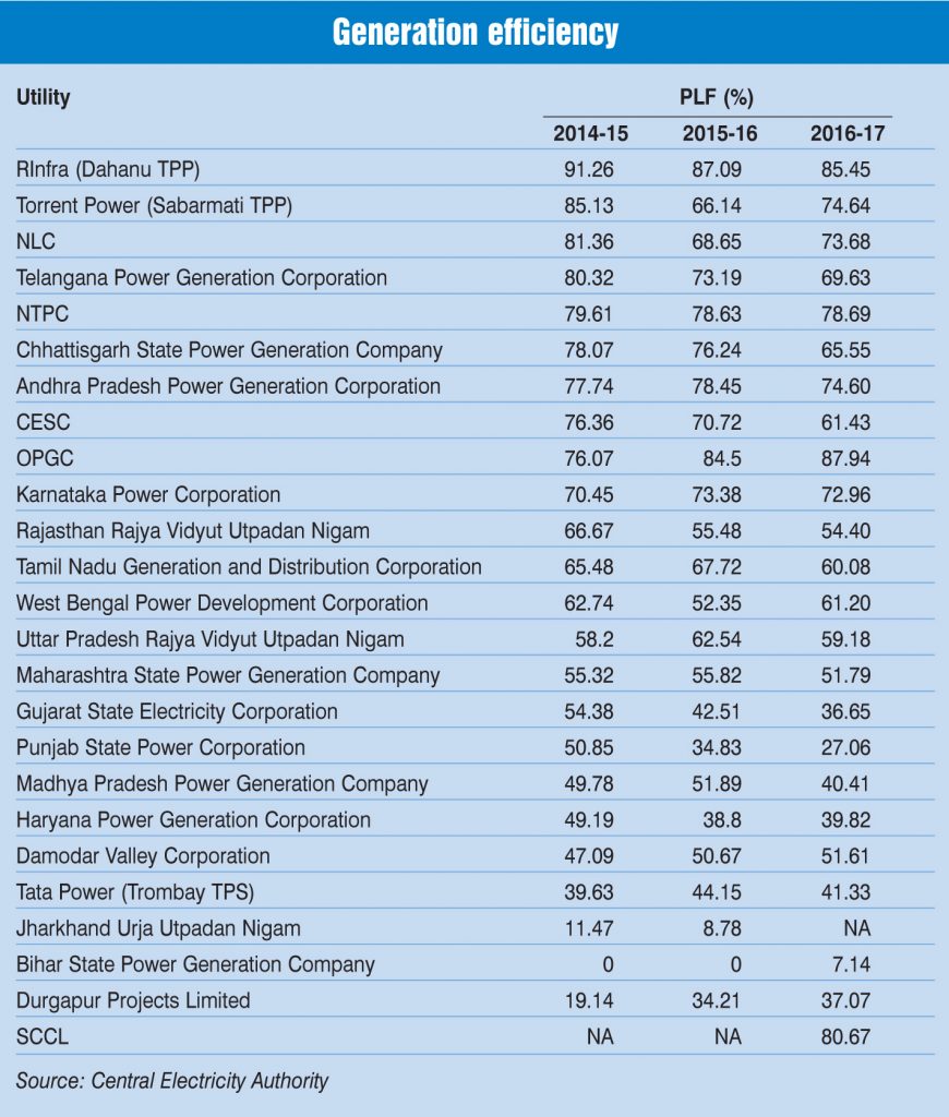 Among the central utilities, the Neyveli Lignite Corporation (NLC) was the outperformer, with the highest increase in PLF from 68.65 per cent in 2015-16 to 73.68 per cent in 2016-17. All the power plants of NLC reported increased PLFs. The PLF of India’s largest power producer, NTPC Limited, recorded an almost equivalent PLF of 78.69 per cent compared to 78.63 per cent in 2015-16. The best performing plant of NTPC was the Sipat super thermal power station (TPS) at 91.09 per cent PLF, whereas the lowest performing plant was the Badarpur TPS, operating at 27.61 per cent PLF. Meanwhile, central PSU Damodar Valley Corporation did not record any significant increase in its PLF, and stayed flat at 51.61 per cent from 50.67 per cent in 2015-16.