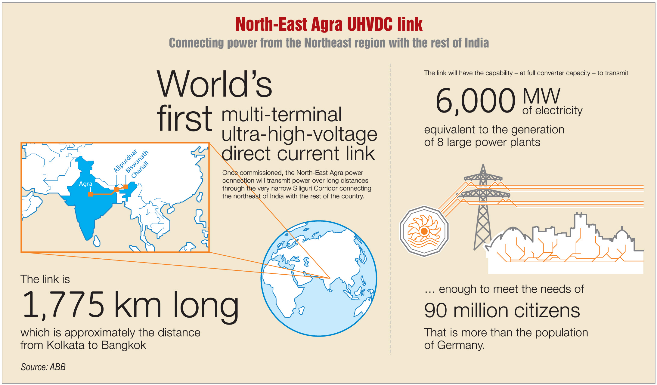 The North-East Agra project has four terminals located at three converter stations. The converter stations are located at Biswanath Chariali (Assam), Alipurduar (West Bengal) and Agra. The stations at Biswanath Chariali and Alipurduar, which have one rectifier terminal each, can handle a total of 6,000 MW of power (3,000 MW each), while the one at Agra with two terminals in parallel configuration can handle 6,000 MW. The project has been designed with a continuous 33 per cent overload feature, the first of its kind in the world. The earth electrode has been designed for 5,000 amperes direct current continuous current.