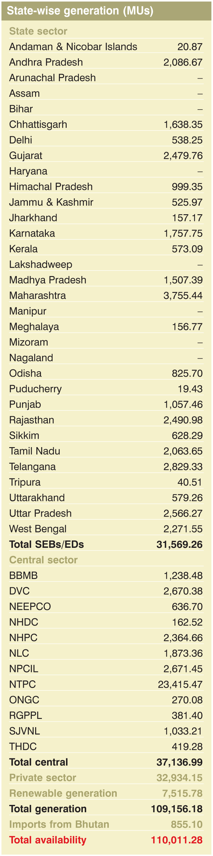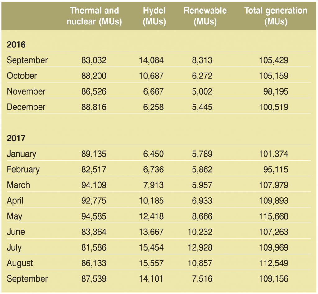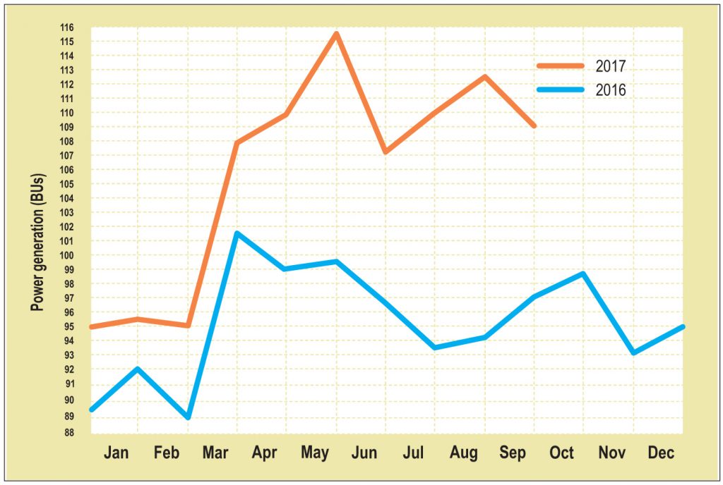 Total power generation stood at 109.16 BUs in September 2017. At around 37.14 BUs and 32.93 BUs, the central and private sectors respectively accounted for the major share in conventional power generation. Meanwhile, renewable energy generation stood at 7,516 MUs.