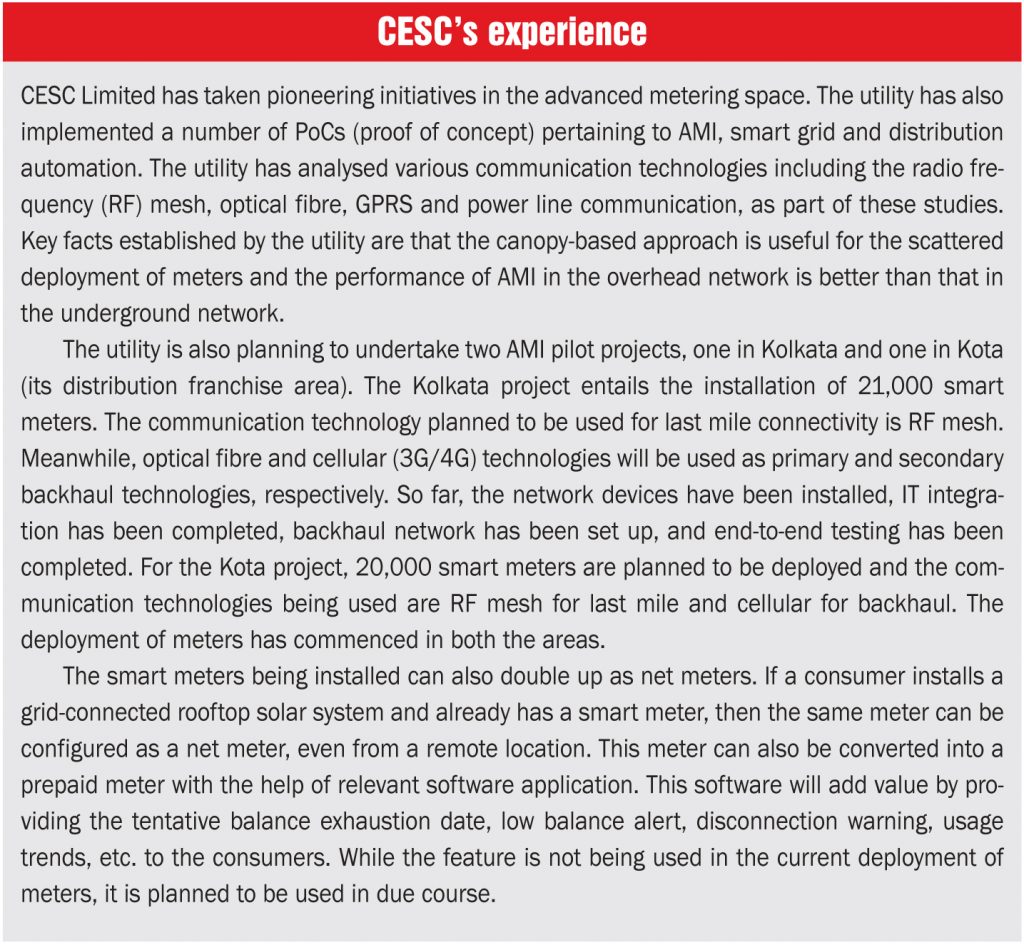 AMI enables near-real-time monitoring of the system including feeders, distribution transformers and consumers through unified interface. It also promotes the participation of individuals at all levels by providing them important information through SMS/app alerts and emails. AMI helps utilities in better asset utilisation, technical loss reduction, capex and opex reduction by data integration, grid optimisation and enhanced revenue collection. This, in turn, improves system reliability. AMI also helps avail of ToD tariff benefits by displaying dynamic pricing during peak and non-peak hours. The smart meters used in AMI can function in both prepaid and post-paid mode. Smart meters can also function as net metering systems to calculate the bidirectional flow of electricity.