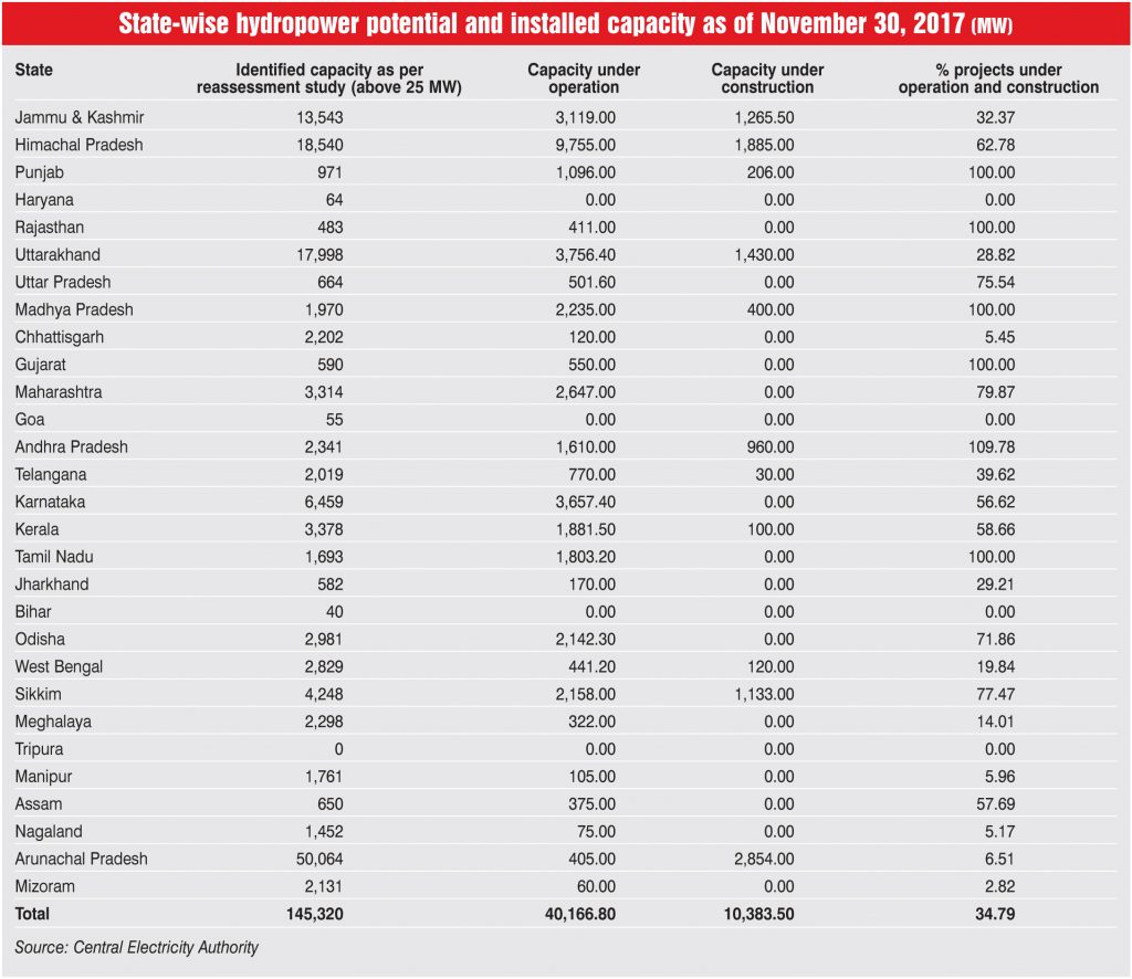 Around 73 per cent of the country’s hydropower potential aggregating 148 GW is concentrated in five states – Arunachal Pradesh, Himachal Pradesh, Jammu & Kashmir, Karnataka and Uttarakhand. Amongst these, Arunachal Pradesh has the highest potential of over 50 GW, that is, almost one-third of the total hydroelectric potential in the country. The development of this potential, however, presents a different picture. Merely 405 MW of capacity is operational in the state, which is less than 1 per cent of its potential. On the other hand, hydro-rich states like Himachal Pradesh and Uttarakhand with 18 GW of potential each have harnessed nearly 53 per cent and 21 per cent of their hydropower capacity respectively. Meanwhile, in Jammu & Kashmir, nearly 23 per cent of the state’s 14 GW hydropower potential has been exploited and in Karnataka, the operational hydropower capacity represents 57 per cent of its potential of 6.6 GW.