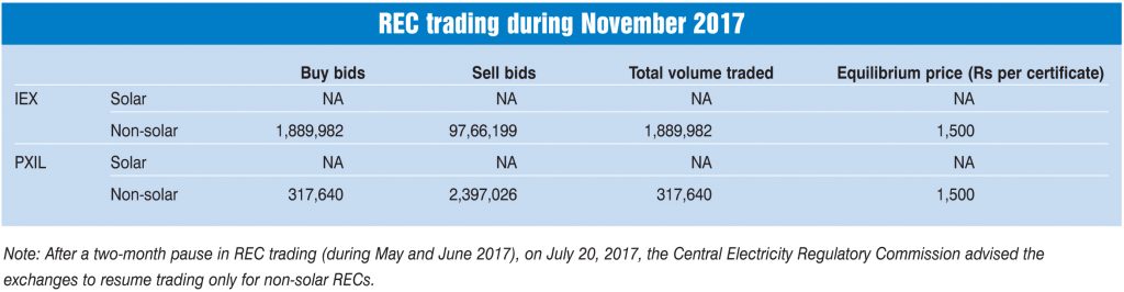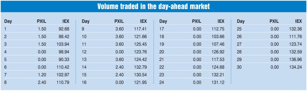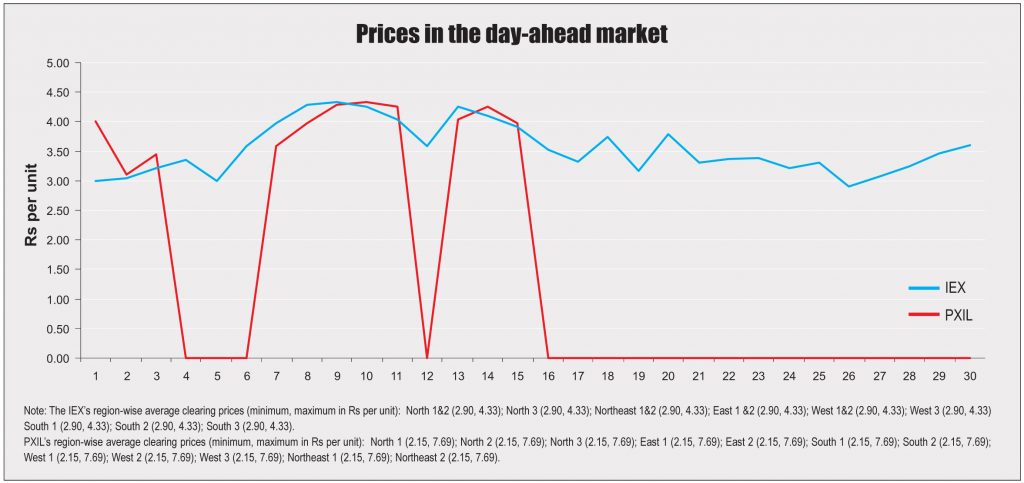 The electricity traded in the day-ahead market at the IEX and PXIL in November 2017 was 3,524 MUs and 27.30 MUs respectively. The average market clearing price range at the IEX was Rs 2.90 per unit to Rs 4.33 per unit and at PXIL was Rs 3.11 per unit to Rs 4.33 per unit.