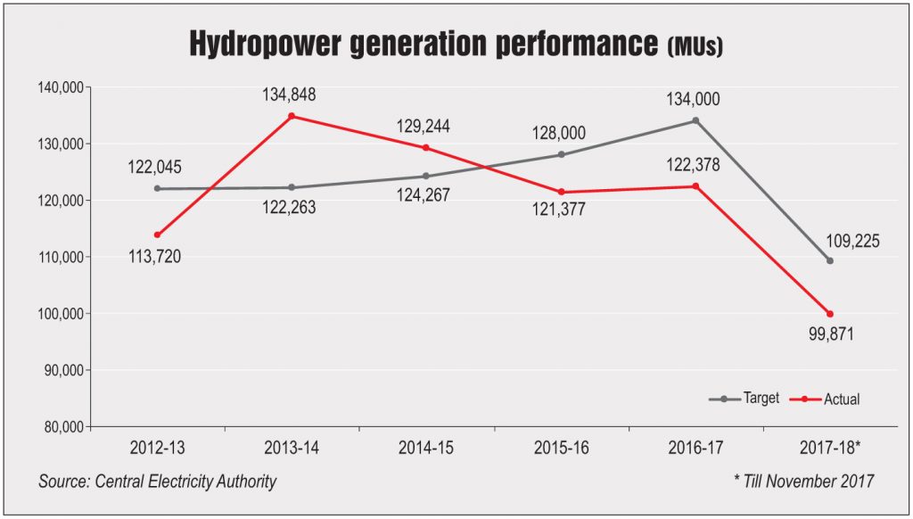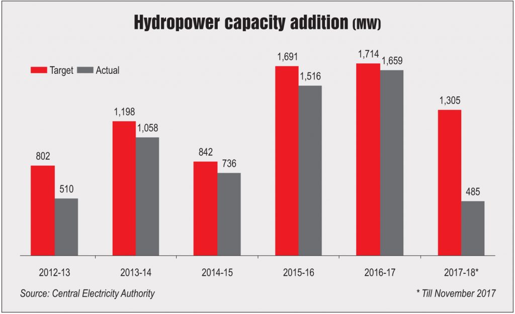 However, the share of hydropower in the total installed capacity has been declining consistently, from 17.7 per cent in March 2013 to 13.6 per cent in March 2017. This is because of significantly low capacity addition in the segment as compared to the growth in the country’s total installed capacity during this period. For the past many years, the capacity addition has not been in line with the targets. While actual capacity addition in 2012-13 was 37.5 per cent less than the target, it was underachieved by only 1.1 per cent in 2016-17. The capacity addition has also missed the overall target for the Twelfth Five Year Plan period ended March 2017. Against a targeted addition of 10.9 GW during 2012-17, the actual achievement was around 5.5 GW only.