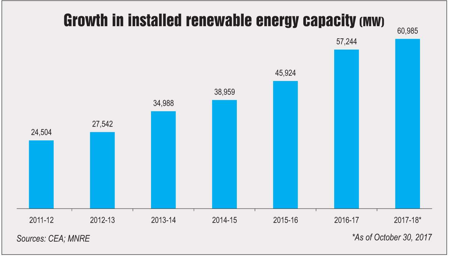The renewable energy segment presents an attractive investment opportunity in the power sector with record capacity additions, declining tariffs and growing private sector participation. In 2016-17, 11.3 GW of renewable capacity was added, comparable with thermal capacity additions of 11.5 GW during the year. As of end-October 2017, the installed renewable energy capacity stood at over 60 GW, accounting for 18 per cent of the total installed power capacity.