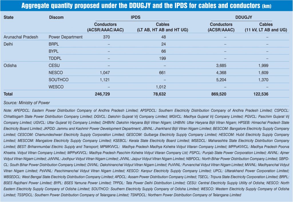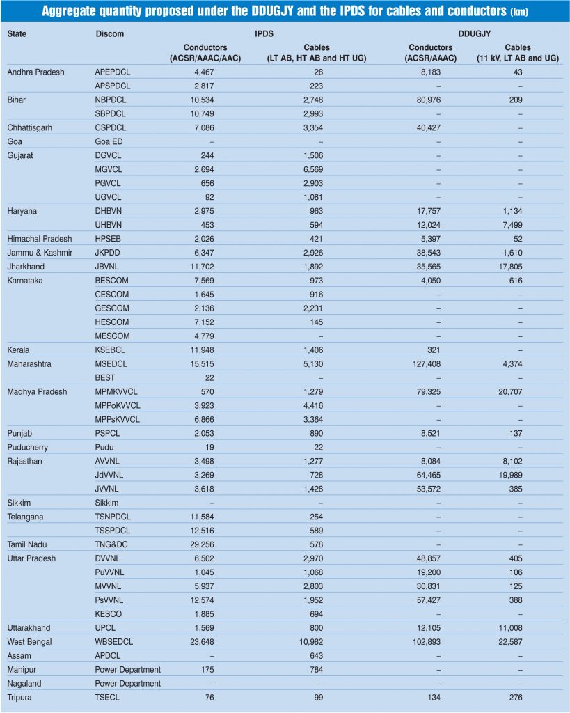 According to official estimates, the total material requirement across states under the DDUGJY is expected to include 856,134 km of aluminium conductor steel reinforced (ACSR) conductors and 13,387 km of all-aluminium alloy conductors (AAAC). Apart from this, 122,535 km of low tension (LT), high tension (HT) and UG cables would be required. Meanwhile, under the IPDS, the total requirement of ACSR/AAAC conductors is envisaged to be around 246,720 km. In addition, the quantities of 11 kV/LT AB cables and UG cables are estimated to be 68,464 km and 10,165 km respectively.