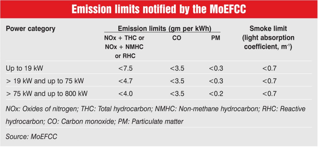 The Central Pollution Control Board has been regulating emissions from diesel generators at the manufacturing stage through product certification since 2005. In March 2016, the Ministry of Environment, Forest and Climate Change (MoEFCC) notified environment standards for gensets running on liquefied petroleum gas (LPG)/liquefied natural gas (LNG), diesel with LPG/LNG and petrol with LPG/LNG. The standards were notified with an objective to control emissions and noise across different categories of gensets. These standards are expected to be revised every four to five years. Some of the technologies available for reducing emissions include: