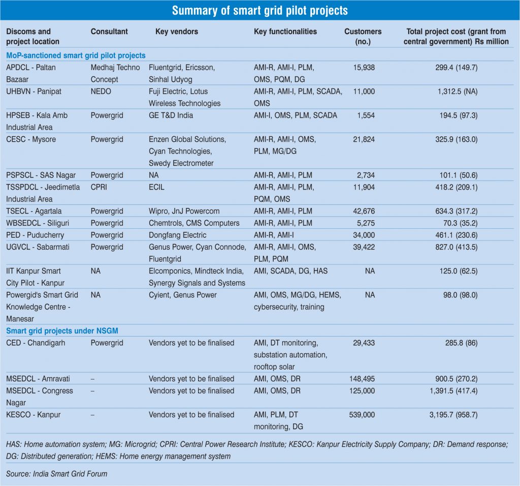 The functionalities being tested in these pilots include advanced metering infrastructure (AMI), outage management system (OMS), peak load management (PLM), power quality management (PQM), distributed generation and supervisory control and data acquisition (SCADA). So far, only one project by Uttar Haryana Bijli Vitaran Nigam Limited has been completed, while the others are at various stages of implementation.