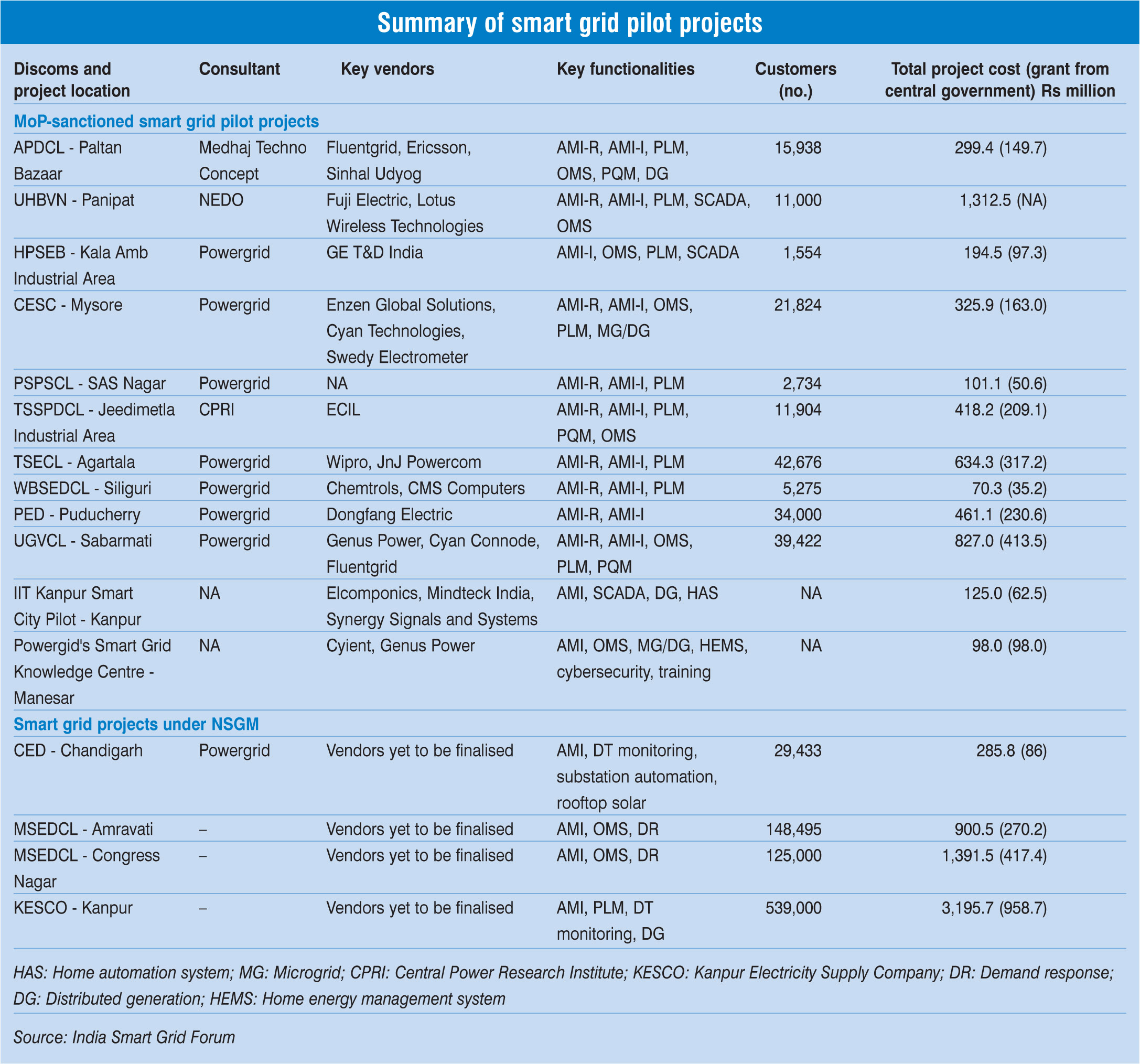 The pilot projects sanctioned by the MoP are being implemented across Assam, Gujarat, Himachal Pradesh, Haryana, Karnataka, Punjab, Telangana, Tripura, Puducherry, Uttar Pradesh and West Bengal, at a total cost of Rs 4.8 billion (including Rs 1.8 billion funding support). These include a smart city demonstration project at the Indian Institute of Technology (IIT)-Kanpur campus and the Smart Grid Knowledge Centre being developed by Power Grid Corporation of India Limited (Powergrid) in Manesar, Haryana. All projects are being partially funded by the MoP, except the project developed by Uttar Haryana Bijli Vitran Nigam (UHBVN), which was funded by the New Energy and Industry Technology Development Organisation (NEDO).