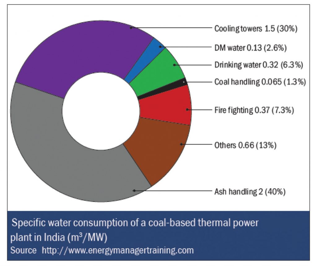 There is no comprehensive information available in the public domain regarding the water consumption of power plants in India. However, in a short-term study (see figure) of the break-up of specific water consumption of a coal-based thermal power plant (TPP), it can be seen that cooling towers and ash handling are the major water-consuming areas and account for about 70 per cent of water use in the plant.