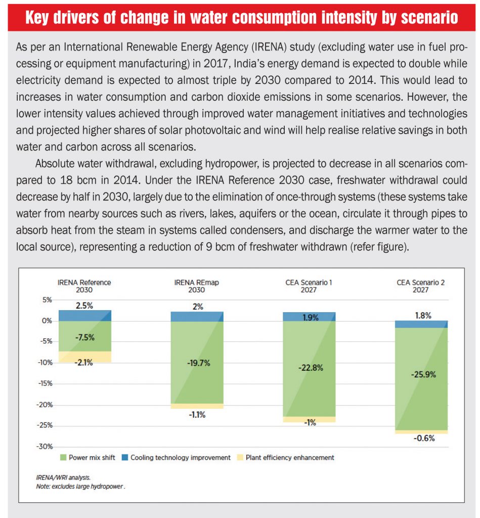 The current water withdrawal intensity of India’s power sector (excluding hydropower) is largely driven by TPPs using once-through cooling systems. Withdrawal intensity could be reduced by upgrading plant cooling technology. From the industry perspective, in order to establish technically feasible benchmarks, the current scenario of water use in TPPs needs to be studied on a priority basis.