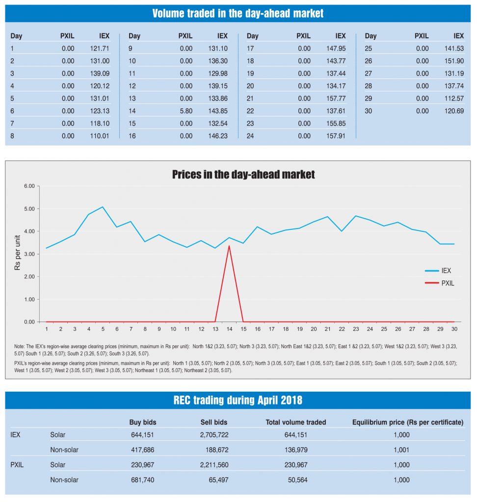 At the IEX and PXIL in April 2018: Prices in the day-ahead market Prices in the day-ahead market April 30, 2018 The electricity traded in the day-ahead market at the IEX and PXIL in April 2018 was 4,055 MUs and 5.8 MUs respectively. The average market clearing price range at the IEX was Rs 3.26 per unit to Rs 5.07 per unit