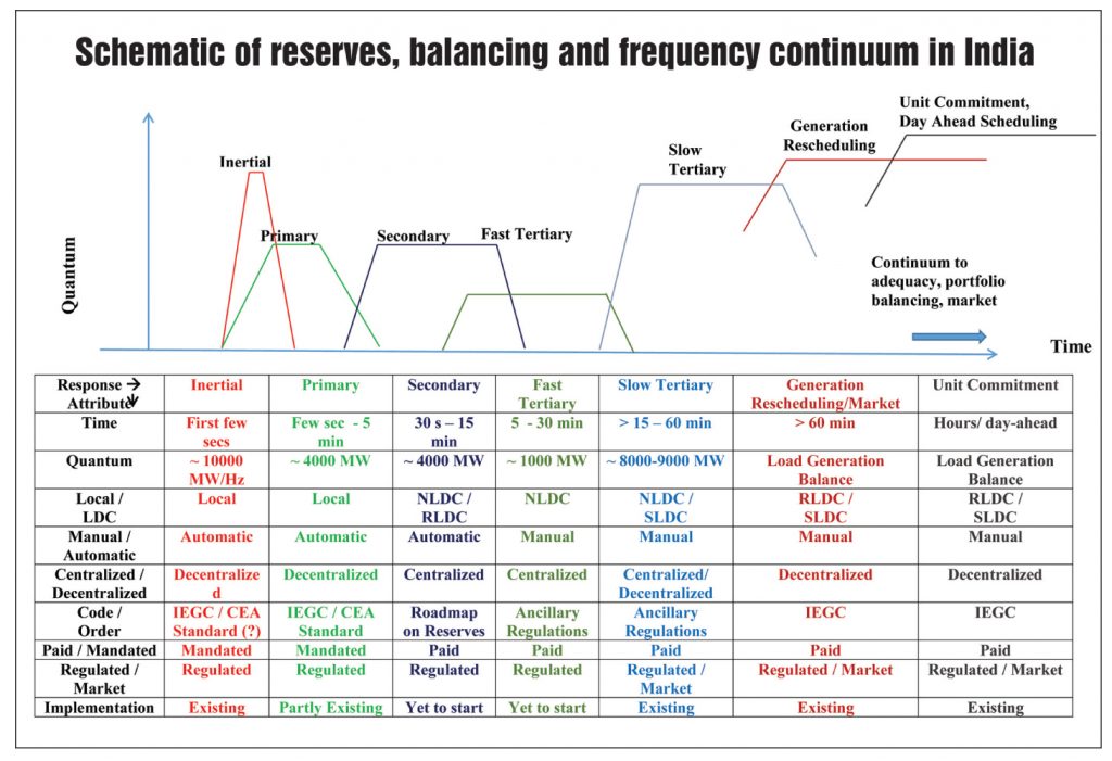 Frequency control as a continuum in terms of time horizon: The report recommends a schematic of reserves, balancing and frequency control continuum (see accompanying figure) and that this schematic should be incorporated in the IEGC through an amendment. The figure indicates the frequency control mechanisms in a continuum starting from a few seconds to a time period of less than an hour. Any persistent deviations beyond this time horizon will be owing to issues related to forecasting, unit commitment, scheduling and despatch.