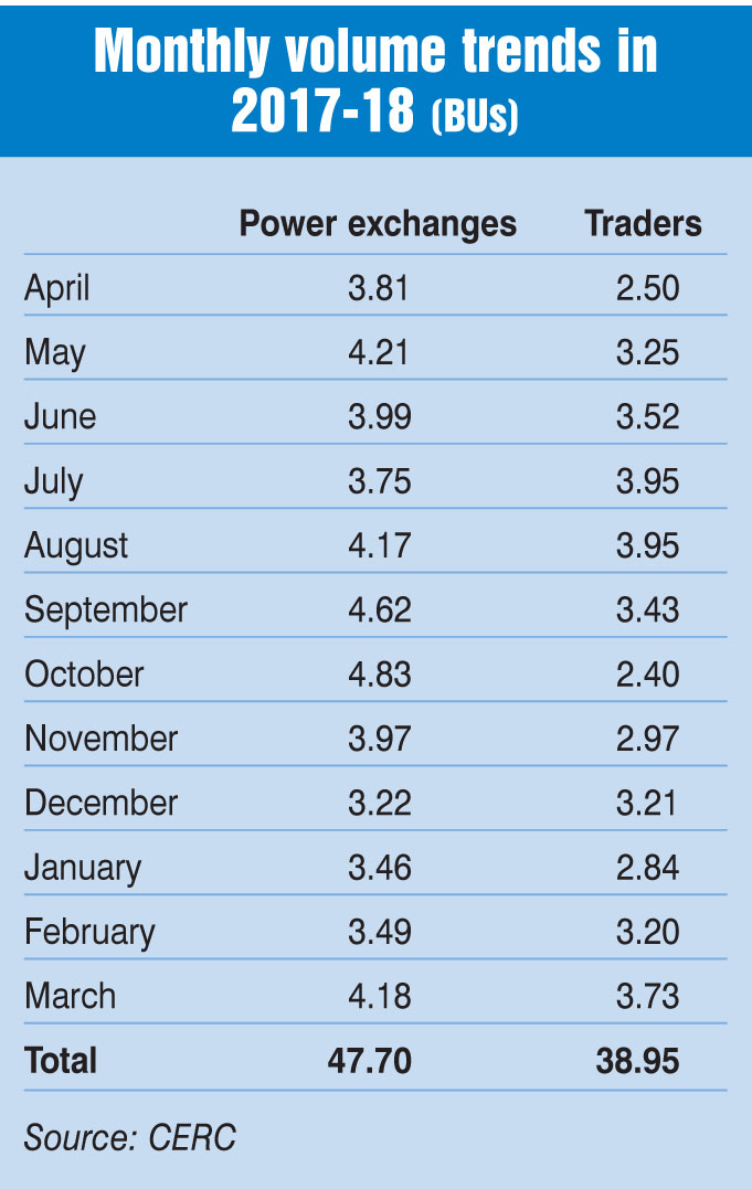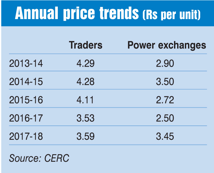 In 2017-18, the weighted average price of electricity transacted through traders was Rs 3.59 per unit, compared to Rs 3.53 per kWh in 2016-17. Around 66 per cent of the volumes transacted during the year were priced at less than Rs 4 per unit. The major buyers of power through traders during 2017-18 were the discoms of Punjab, Telangana, Bihar, Maharashtra and Chhattisgarh.