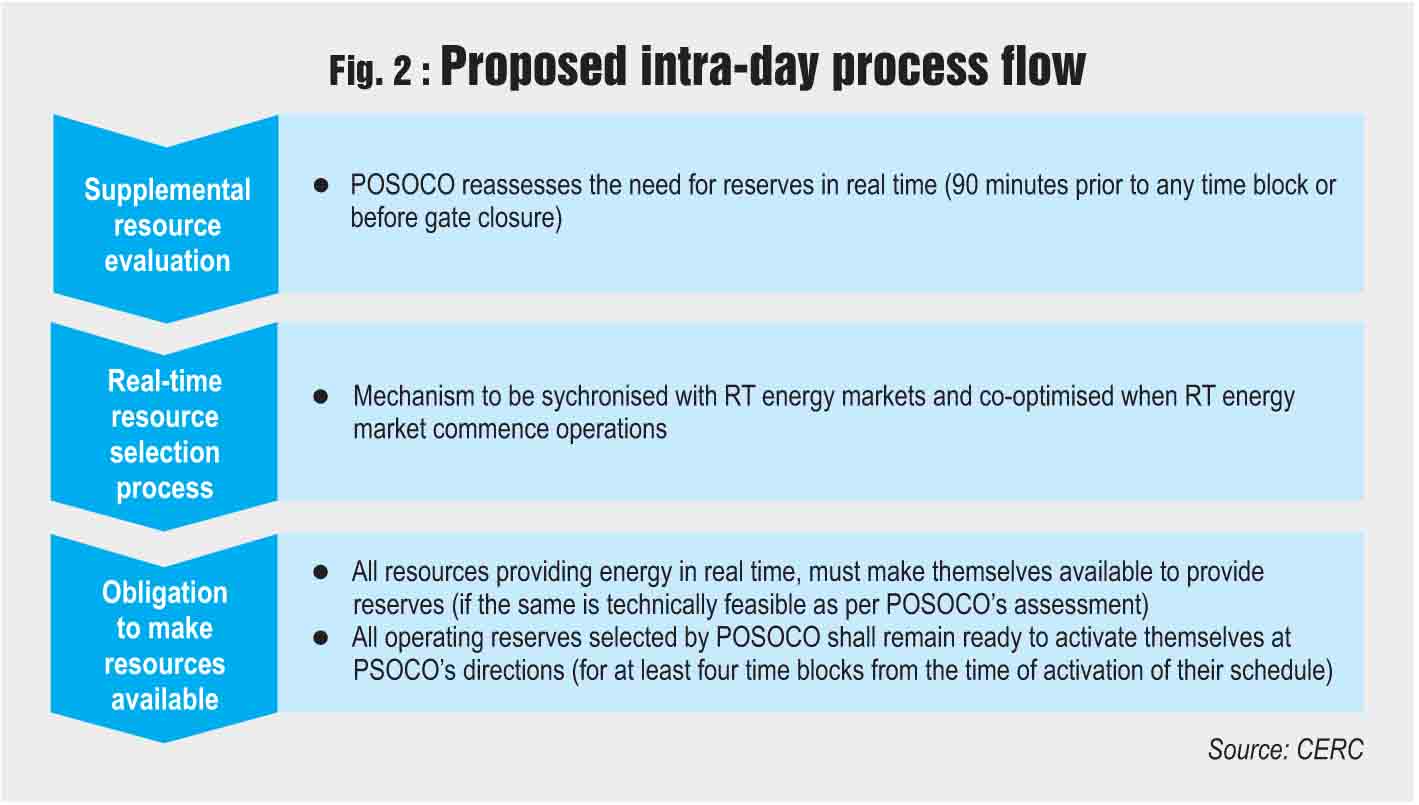 Proposed ancillary services: The paper proposes introduction of two types of tertiary reserves – slow spinning reserves and slow non-sychronised reserves together classified as total slow reserve. Slow spinning reserves refer to operating reserves provided by qualified generators and demand-side resources within the RLDC control area that are already synchronised with the grid and can respond to instructions from the RLDC/state load despatch centre (SLDC) to make changes in the output within 15 minutes and 30 minutes. Reserves (generators) that can be started, synchronised and loaded within 15 minutes and 30 minutes are classified as slow non-synchronised reserve.