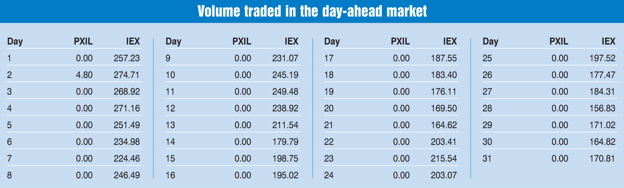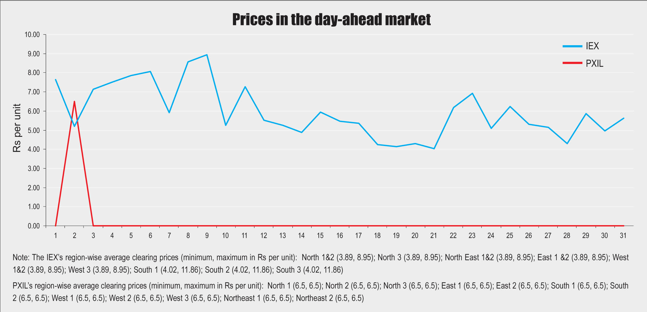 The electricity traded in the day-ahead market at the IEX and PXIL in October 2018 was 6,505 MUs and 4.8 MUs respectively. The average market clearing price at the IEX ranged from Rs 4.04 per unit to Rs 8.95 per unit, and at PXIL it was Rs 6.50 per unit.