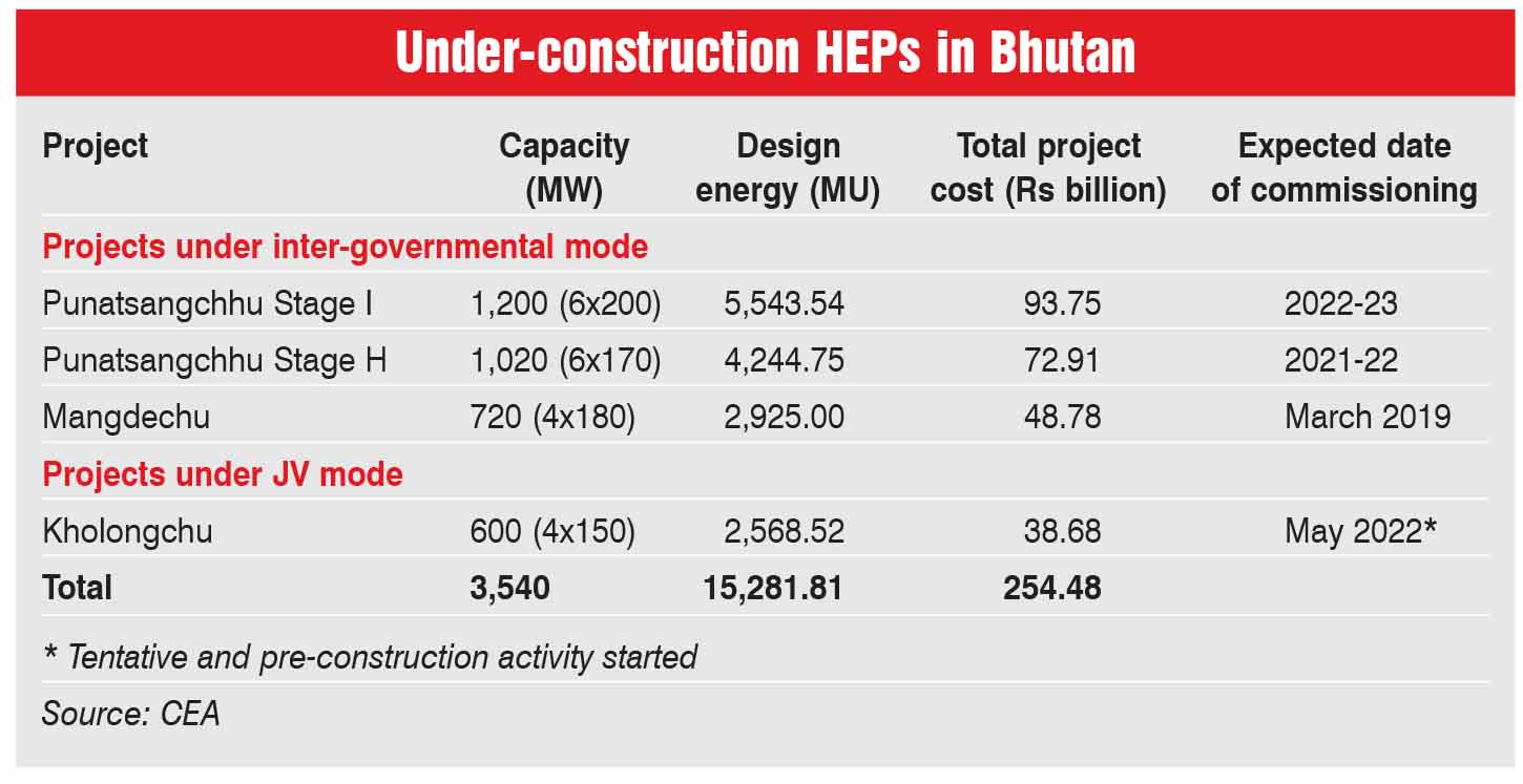 In addition, four HEPs aggregating 3,540 MW are currently under construction under the Indo-Bhutan Energy Cooperation. They entail a total investment of Rs 254.48 billion. Three HEPs aggregating 2,940 MW are being developed in intergovernmental mode. These are the 1,200 MW Punatsangchhu Stage-I HEP entailing a cost of Rs 93.75 billion and scheduled to be commissioned in 2022-23, the 1,020 MW Punatsangchhu Stage-II HEP of Rs 72.91 billion scheduled to be commissioned in 2021-22, and the 720 MW Mangdechu HEP worth Rs 48.78 billion scheduled to be commissioned in March 2019. Meanwhile, the 600 MW Kholongchu HEP with a cost of Rs 38.68 billion is being developed by Kholongchhu Hydro Energy Limited, a joint venture (JV) between India’s SJVN Limited and Bhutan’s Druk Green Power Corporation (DGPC). It is scheduled to be commissioned by May 2022.