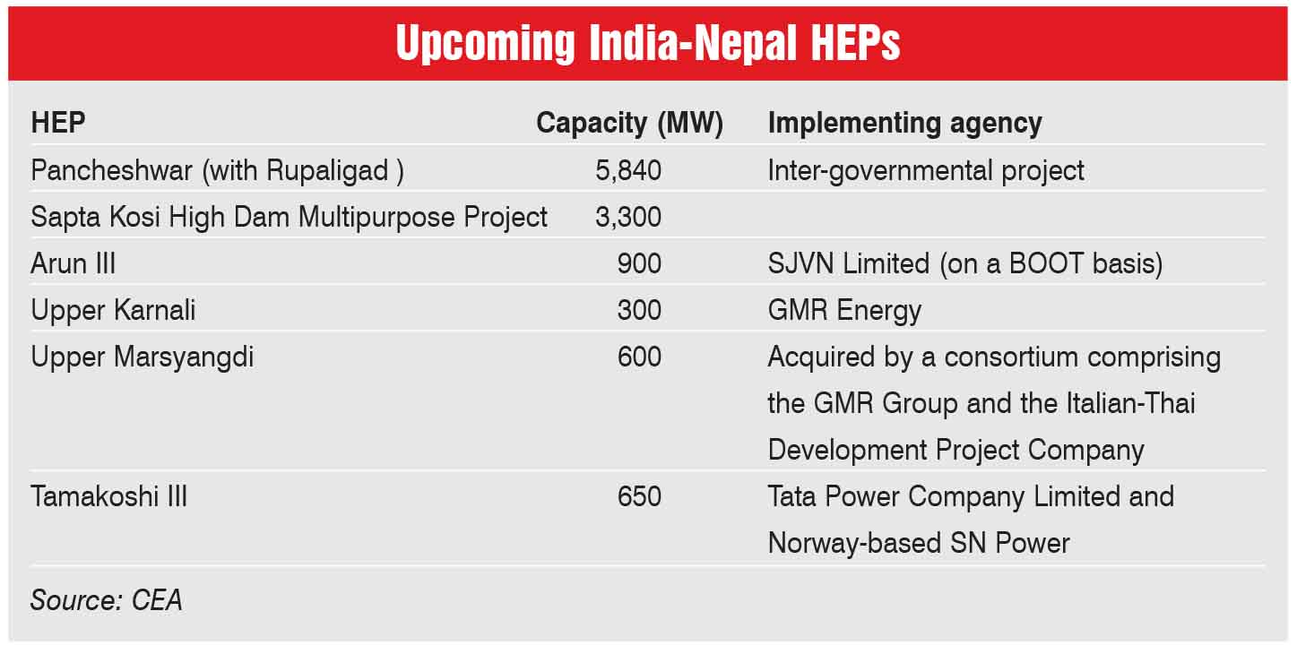 Another key trend is the growing participation of Indian private companies in Nepal’s hydropower segment. GMR Energy is implementing the 900 MW Upper Karnali HEP, a run-of-the-river project, in the western part of Nepal on a BOOT basis. GMR Energy will provide 12 per cent of power to Nepal free of cost and pay 27 per cent free equity to the Nepal government. The project with an estimated cost of $1,412 million is expected to generate 3,466 MUs of power annually. It is scheduled to be commissioned in 2023-24. Further, a consortium of the GMR Group and Italian-Thai Development PLC is developing the 600 MW Upper Marsyangdi HEP in Nepal. Located in Lamjung and Manang districts, the project is being developed by Himtal Hydropower Company Private Limited, the Nepalese subsidiary of GMR Energy Limited. The project development agreement (PDA) is yet to be signed.