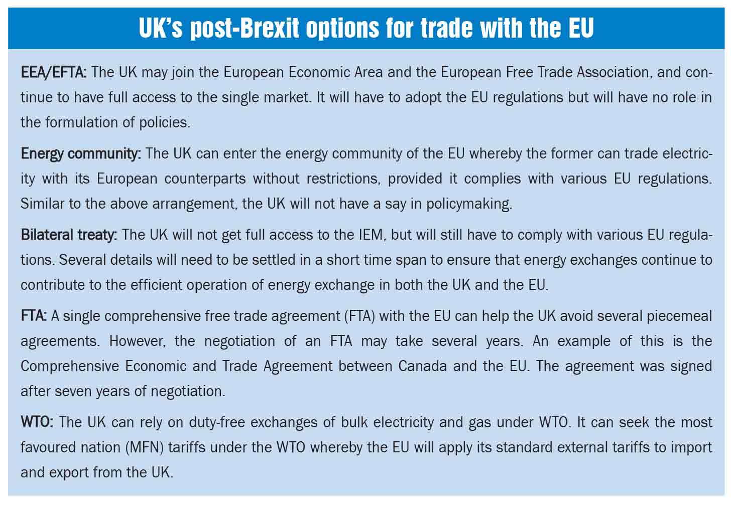 The UK has various options of continuing energy trade with the EU (refer box). There is currently no agreement to replace the regulations that govern trade between the UK and the EU. A “no-deal” scenario looks most probable. Recent developments indicate that the UK may be forced to request for a three-month extension of the negotiating period to prevent a “no-deal” departure.