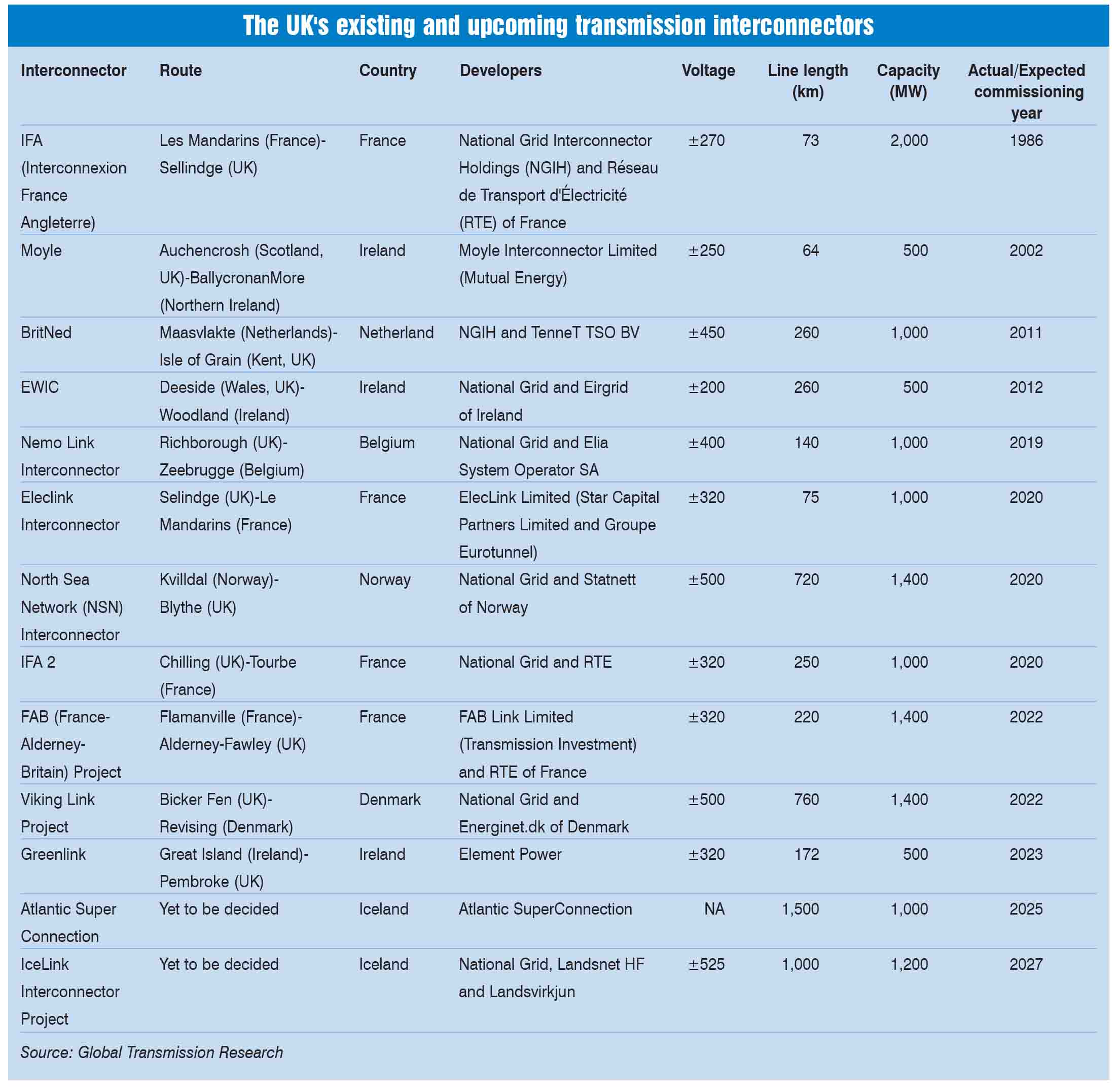 The UK is interconnected with continental Europe and Ireland through five high voltage direct current links, with an aggregate capacity of 5 GW. The latest interconnector, which started commercial operations recently, is the NEMO Link interconnector with Belgium. Further, there are at least eight projects with close to 9 GW of capacity that are under development. Of these, three interconnectors, namely, Eleclink and IFA2 (with France), and NSN (with Norway), are expected to come online by 2020 while the others are expected to be commissioned between 2022 and 2027. By 2022, electricity interconnectors with EU countries are expected to meet 35 per cent of the UK’s peak electricity demand.