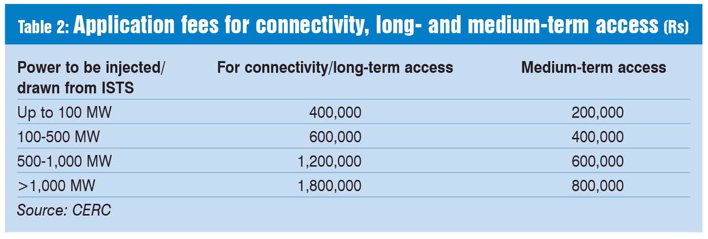 - The regulations specify the slabs for non-refundable application fees for connectivity, long- and medium-term open access, which varies with capacity. The fee for short-term access is determined as per the provisions under the CERC’s STOA regulations.