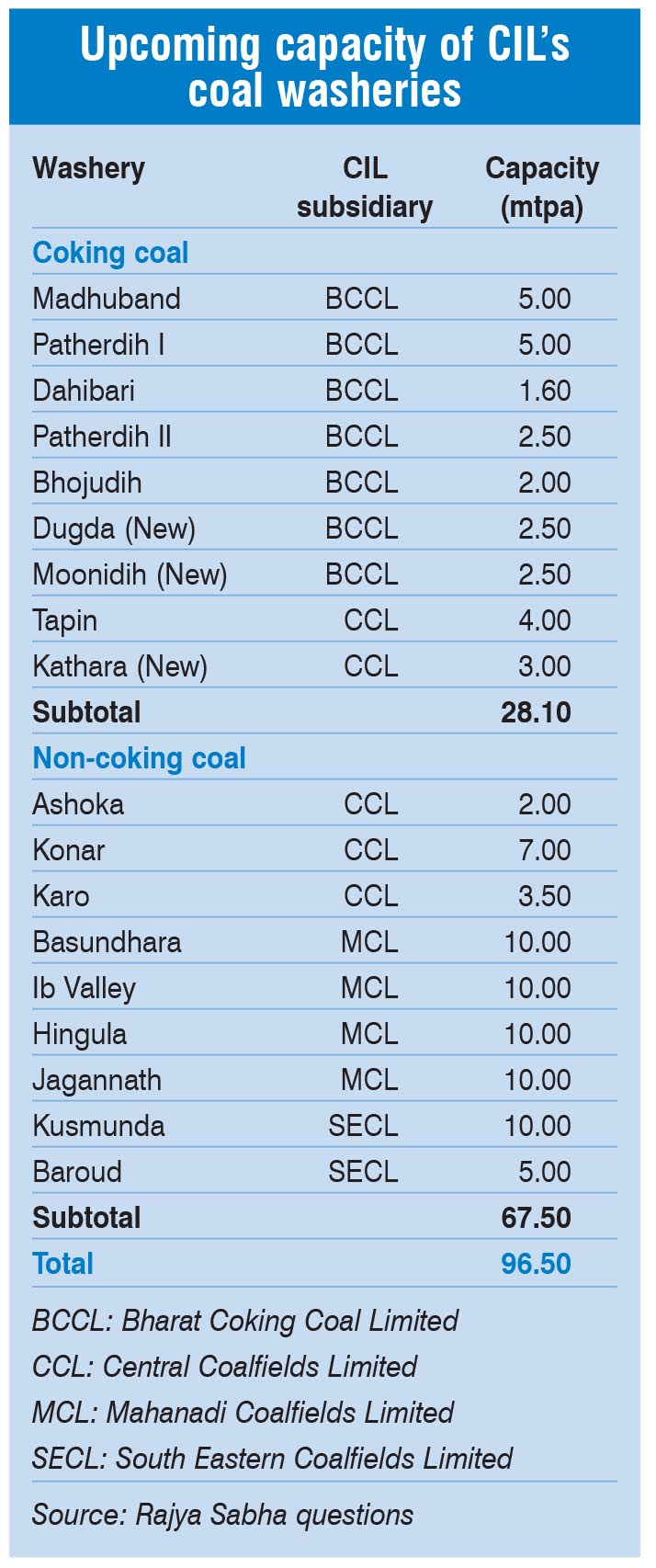CIL has proposed to set up 18 coal washeries aggregating 95.6 mt – nine coking coal washeries totalling 28 mt and nine non-coking coal ones aggregating 67.5 mt.