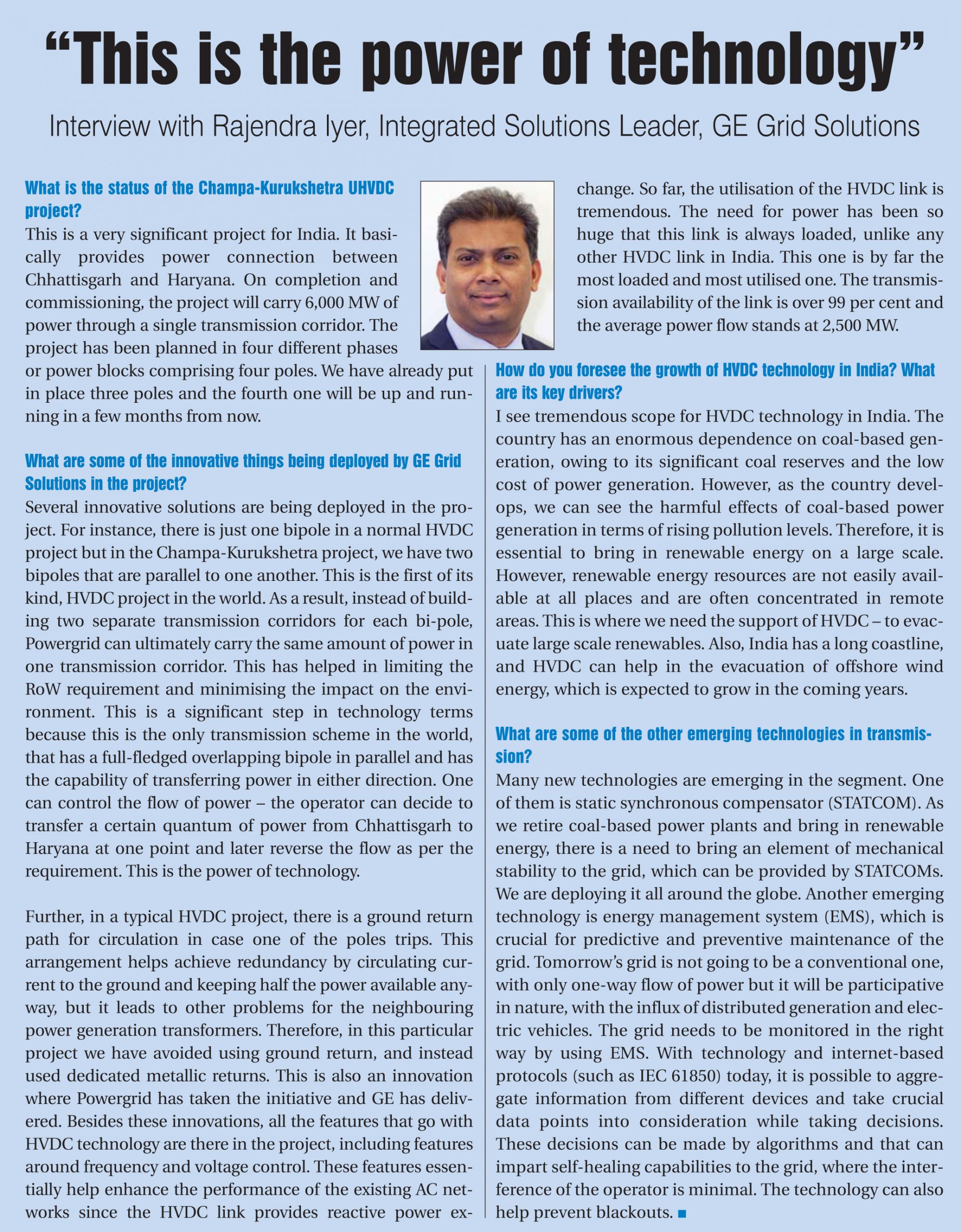 The Champa-Kurukshetra HVDC project is certainly a technological marvel and on completion it would further strengthen and enhance the transmission network in the country. Going forward, HVDC technology is expected to grow, given the country’s need to evacuate the large quantum of upcoming renewable energy. Further, various techno-economic factors such as the need for bulk transmission over long distances, high transmission losses in overhead AC lines, right of way issues and technological constraints of other extra high voltage technology options are likely to drive the growth of HVDC technology in the coming years.