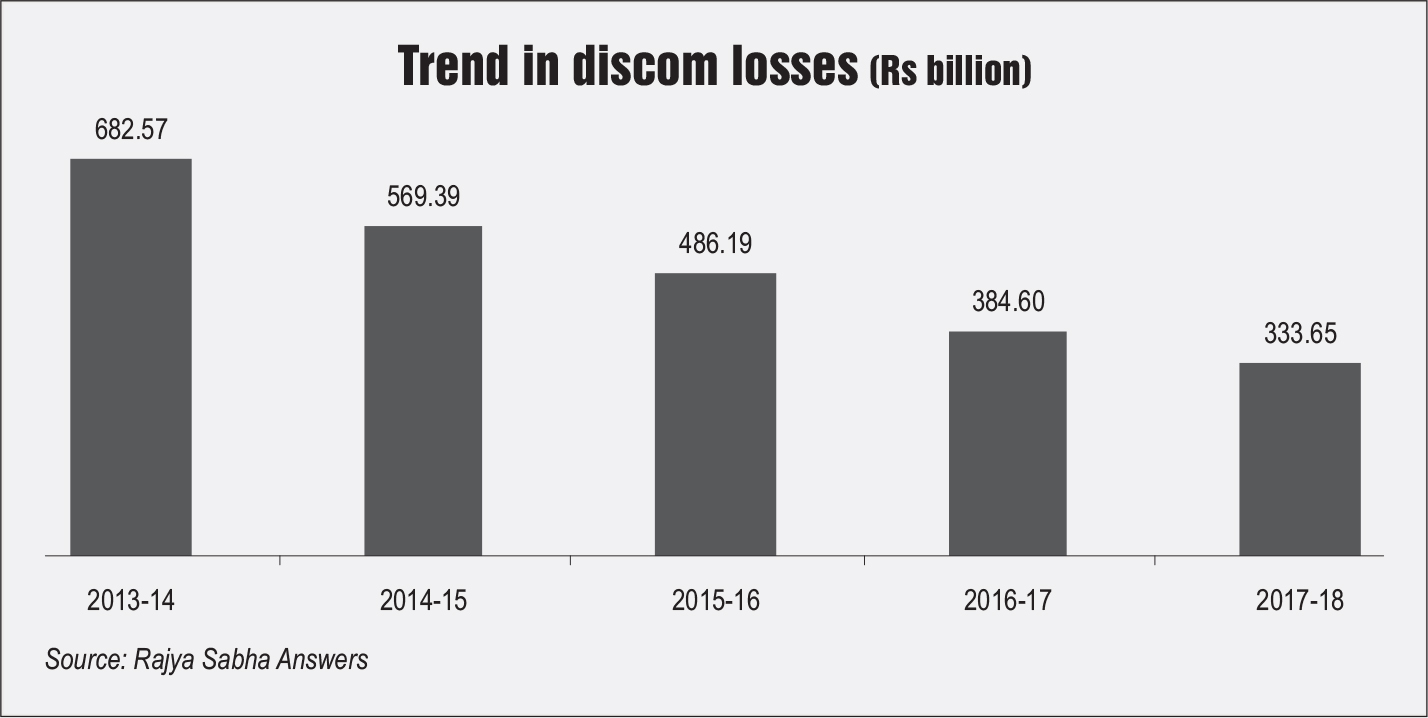 Discom losses witnessed a significant decline between 2013-14 and 2017-18. As per the latest information furnished by the Ministry of Power (MoP) in the Rajya Sabha question-answer session, discom losses have declined from Rs 682 billion to Rs 333 billion. The decline in discom losses could be attributed largely to debt restructuring done under UDAY, reduction in AT&C losses and an increase in tariff rates.